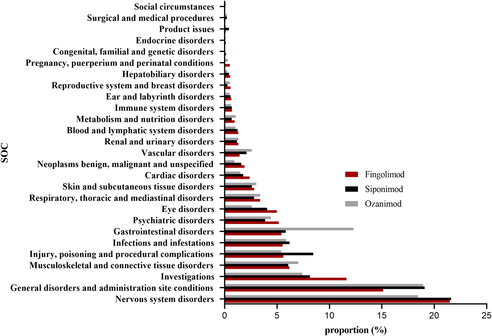 Proportion of S1PR modulators-related AEs at the System Organ Class (SOC) level. AEs, adverse events; S1PR, Sphingosine-1-phosphate receptor.