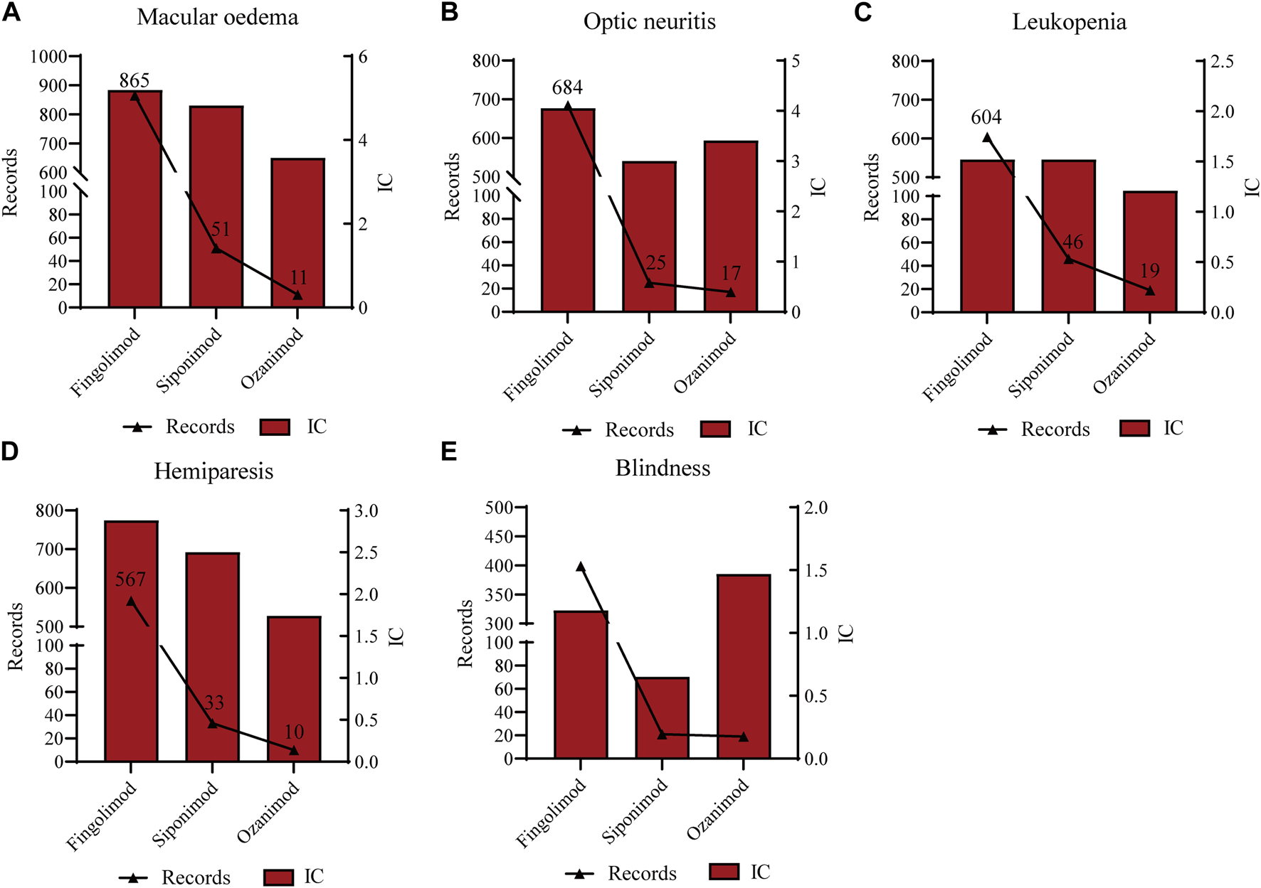 Overall, 276,436 reports of fingolimod, 20,972 reports of siponimod and 10,742 reports of ozanimod were analyzed from the FAERS database. Among reports, females were more prone to develop AEs (73.71% for females vs. 23.21% for males), and more than 50% of patients suffered from AEs were between 18 and 64 years. Subsequently, we investigated the top 20 AEs associated with the signal strength of S1PR modulators at the preferred term (PT) level, and identified 31 (8 vs. 11 vs. 12, respectively) unlabeled risk signals such as thrombosis, uterine disorder and reproductive system and breast disorders. Furthermore, we discovered that the S1PR modulator reported variations in the possible IMEs, and that the IMEs associated with ocular events were reported frequently. It’s interesting to note that infection and malignancy are prominent signals with both fingolimod and siponimod in the top 20 PTs related to mortality reports.