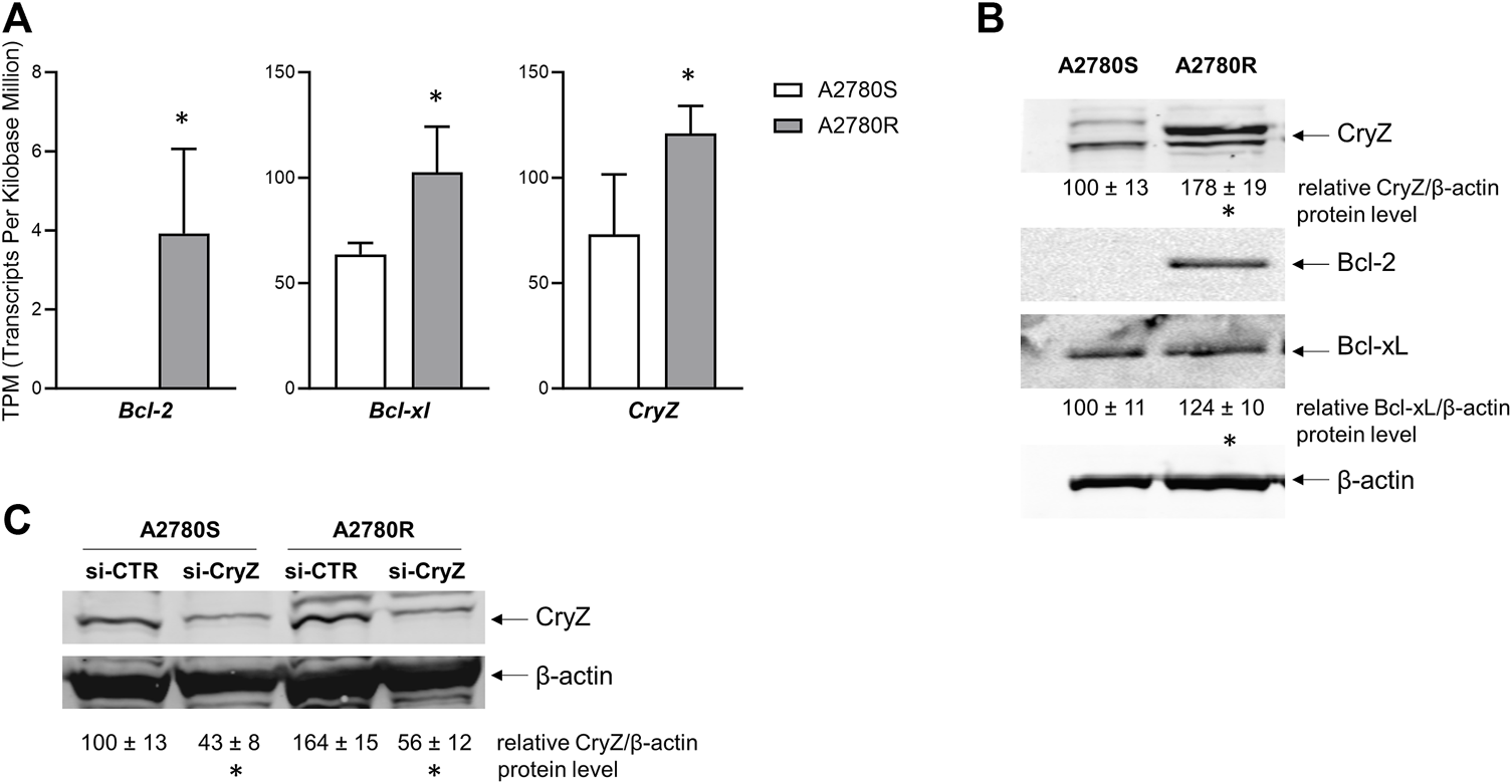 (A) Transcriptomic analysis of Bcl-2, Bcl-xl and CryZ genes in A2780S and A2780R; data represent mean ± SD of at three independent experiments (*p < 0.05 vs. A2780S). (B) Western Blotting analysis of Bcl-2, Bcl-xl and CryZ, including quantitative analysis, in A2780S and A2780R; the image is representative of three different experiments. β-actin was used as housekeeping control (*p < 0.05 vs. A2780S). (C) Western Blotting analysis of CryZ, including quantitative analysis, in A2780S and A2780R transfected with si-CTR or si-CryZ; the image is representative of three different experiments. β-actin was used as housekeeping control (*p < 0.05 vs. si-CTR).
