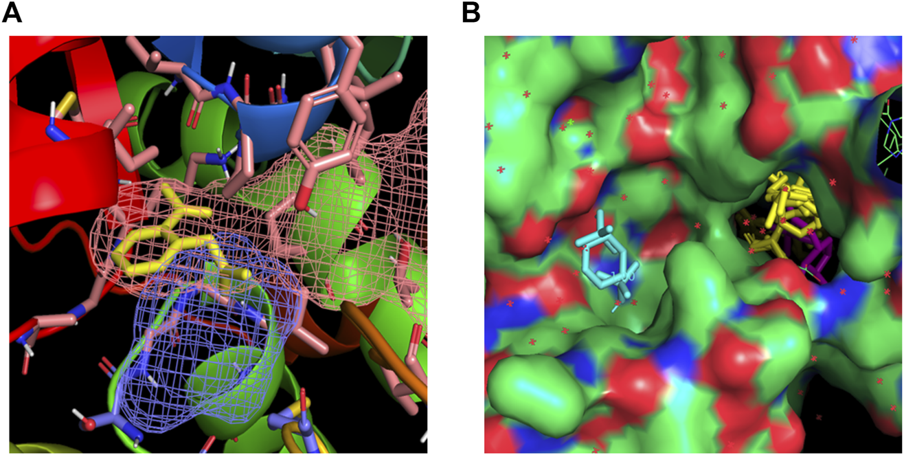 The hotspots identified by FTMap were successively computed by FTSite to identify and rank binding sites. The results confirmed the FTMap evaluation and the docking calculation, identifying a binding site within the NADPH binding region. Figure 2A shows the identified binding site highlighted in mesh, along with the key interacting residues that correspond to those found interacting with ASA in the docking calculation.