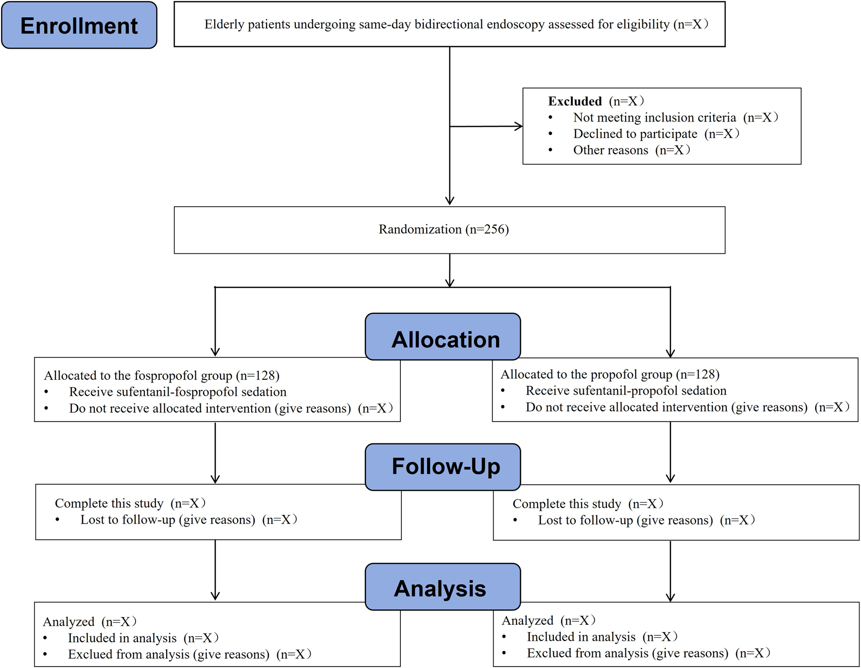 An independent investigator, who is not involved in the subsequent study, screens the admission records for recruitment of eligible patients. Written informed consent will be obtained from the patient or their representative before each patient performed any procedure. At any time during this study, patients can withdraw their consent without any consequence. A total of 256 eligible patients aged 65 years or older, who are scheduled for same-day bidirectional endoscopy under sedation, will be randomly allocated to either fospropofol group or propofol group at a ratio of 1:1 (n = 128 in each group). The flow chart of this study is presented in Figure 1.