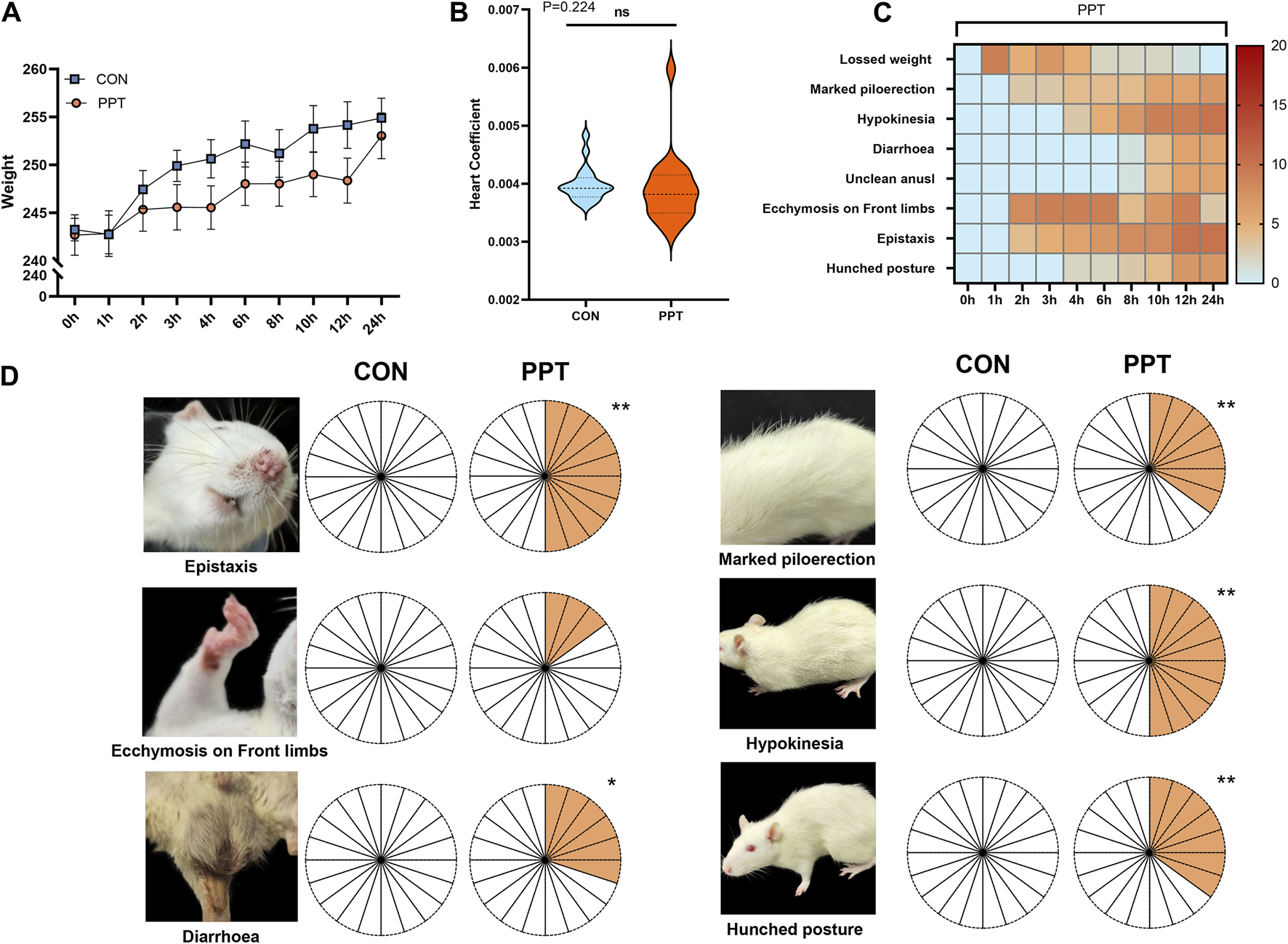 Statistical analysis of rat weight showed that the weight of animals in the CON and PPT groups significantly increased after administration (p < 0.05). Compared with the CON group, the weight difference in rats in the PPT group before and after 24 h of administration was not statistically significant (p > 0.05) (Figure 1A. The statistical analysis of the organ index of the heart showed no statistically significant difference between the PPT and CON groups (p > 0.05) (Figure 1B and Supplementary Table S3). Behavior observation showed no significant changes in the CON group. Compared with the CON group, rats in the PPT group exhibited varying degrees of upright and rough hair, lazy movement, unclean anus, and oronasal hemorrhage. An obvious ecchymosis on the feet (p < 0.01) after 2 h of administration, obvious symptoms of oronasal hemorrhage (p < 0.05) after 3 h of administration, lazy movement (p < 0.05) after 6 h of administration, symptoms of upright and rough hair (p < 0.05) after 10 h of administration, and arched back (p < 0.01) after 12 h of administration (Figures 1C, D and Supplementary Table S1) were noted in rats of the PPT group.