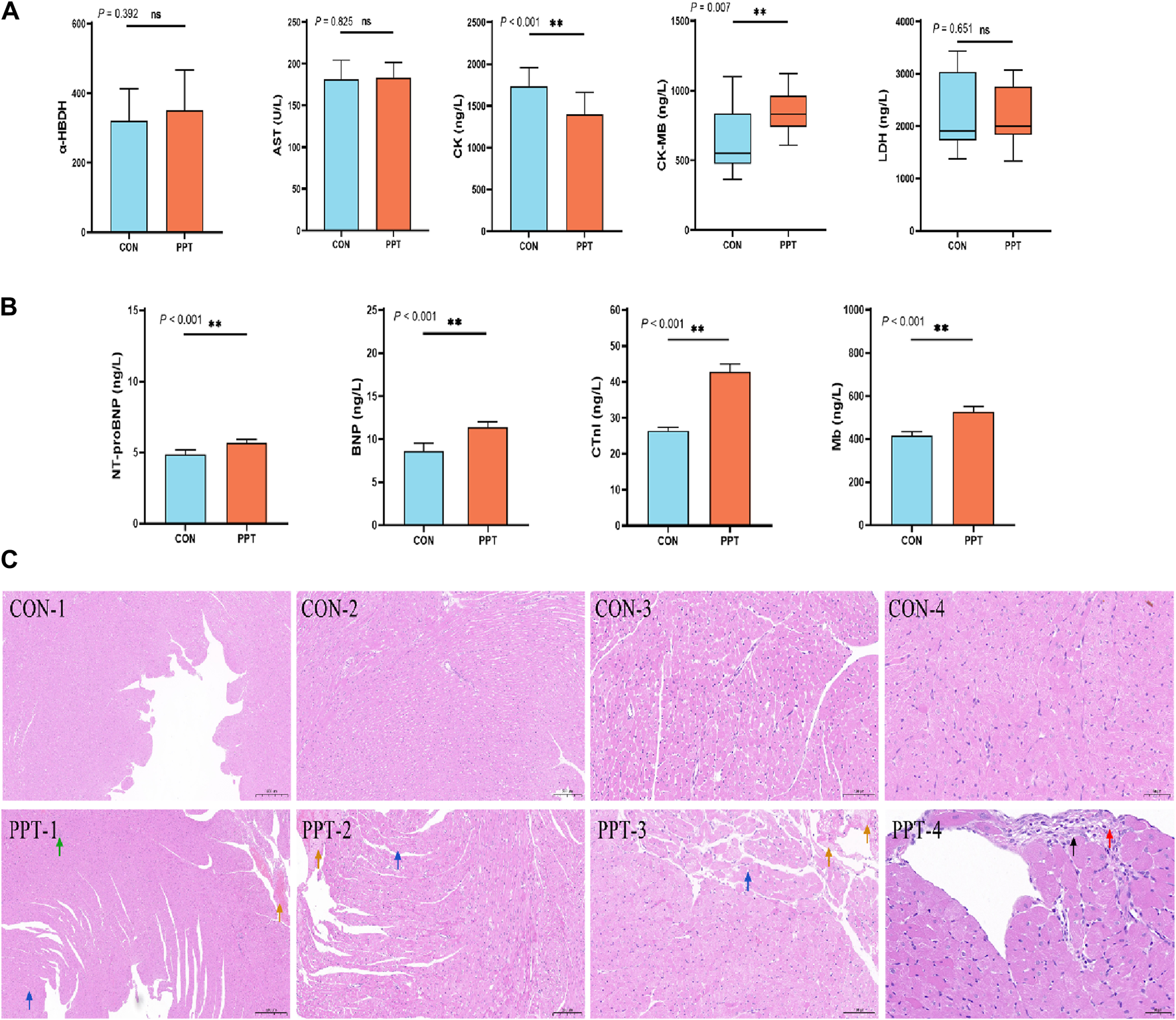 CK, CK-MB, LDH, AST, and α-HBD, commonly used indicators reflecting the degree of myocardial cell damage (Xuan and Jian, 2016), were assessed to evaluate the degree of cardiac damage caused by PPT. The results of serum biochemical parameters are shown in Figure 2A. Compared with the CON group, the levels of CK in the serum of rats in the PPT group were significantly reduced (p < 0.01), while those of CK-MB were significantly increased (p < 0.01); the levels of LDH, AST, and α-HBD showed an upward trend but without statistically significant differences (p > 0.05). These results indicated that after 24 h of gavage of the PPT aqueous solution to rats, serum myocardial enzyme concentrations fluctuated, with the most significant increase in CK-MB and decrease in CK levels.