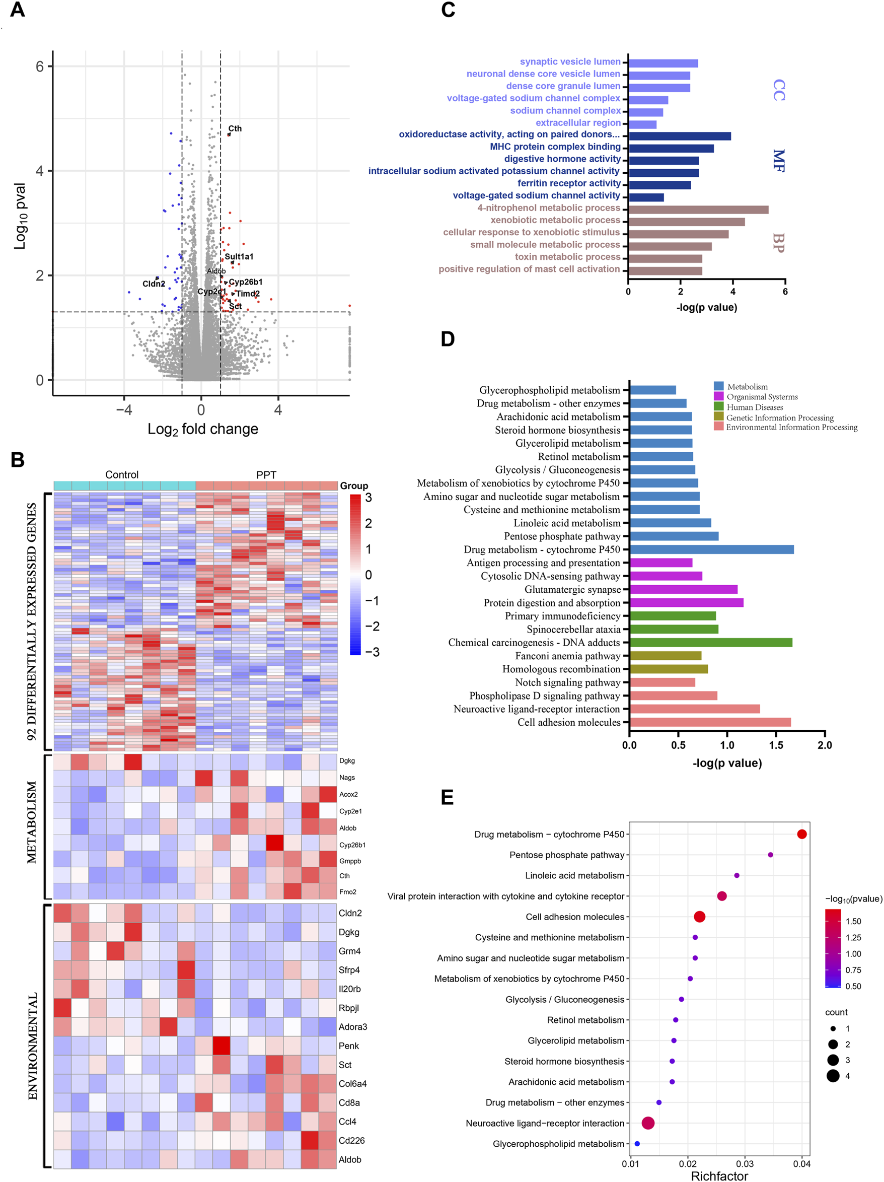 A total of 92 DEGs, including 50 upregulated and 42 downregulated genes, were identified between the CON and PPT groups (Figure 3A). Cluster analysis of DEGs divided the CON group and PPT groups distinctly (Figure 3B). To determine the main biological functions related to DEGs, GO enrichment analysis was conducted (Figure 3C). Exposure to 120 mg/kg PPT primarily induced alterations in acute inflammatory responses, toxin metabolism, exogenous metabolism, positive regulation of mast cell activation, and immune response regulatory signaling pathways. In terms of biological processes (BP), DEGs were mainly enriched in 4-nitrophenol metabolism, toxin metabolism, xenobiotic metabolic process, and positive regulation of mast cell activation. In terms of molecular functions (MF), DEGs were mainly enriched in oxidoreductase activity, MHC protein complex binding, intracellular sodium-activated potassium channel activity, and acetyl CoA activity. In terms of cellular components (CC), DEGs were mainly enriched in the synaptic vesicle lumen, voltage-gated sodium channel complex, dense core granule lumen, and sodium channel complex. Notably, to determine the potential enriched pathways related to DEGs, KEGG pathway enrichment analysis was performed for the 92 DEGs, with the results shown in Figures 3D, E. The primary altered metabolic or signaling pathways included arachidonic acid metabolism, linoleic acid metabolism, glycolysis, pentose phosphate pathway, amino acid metabolism, phospholipase D signaling pathway, and the Notch signaling pathway.