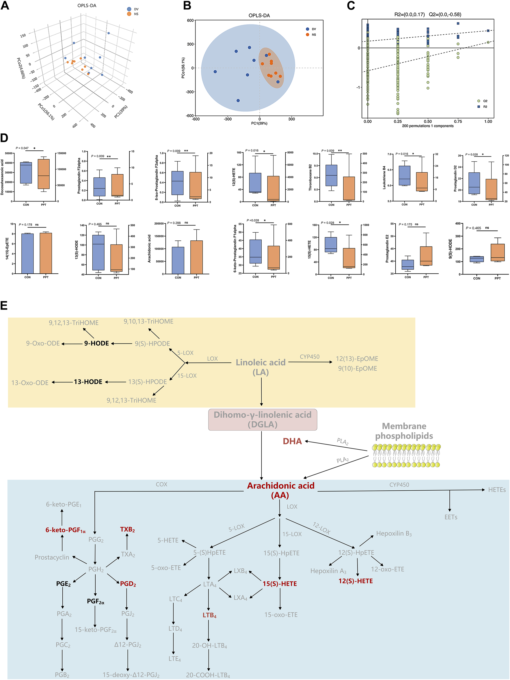 Quantitative analysis was conducted on the 15 metabolites of the arachidonic acid pathway; except for leukotriene D4, which was not detected below the detection limit, the levels of the remaining 14 metabolites were measured in the PPT and CON groups (Table 2; Figure 4D). To distinguish the metabolic profiles among the CON and PPT groups, OPLS-DA in ESI− mode (negative ion mode) was performed for cluster analysis. Significant separation of the CON and PPT groups in OPLS-DA confirmed the reliability and reproducibility of the test method (Figures 4A, B). Furthermore, the permutation plot of PLS-DA showed that the model had no overfitting and was reliable (Figure 4C). Eight differential metabolites with p < 0.05 and FC > 1.5 were selected as differential metabolites, including 12(S)-HETE, 8-iso-PGF2α, TXB2, 6-keto-PGF1α, 15(S)-HETE, DHA, PGD2, and LTB4. Compared with the CON group, all eight metabolites were upregulated after administration of PPT (Figures 4D, E).