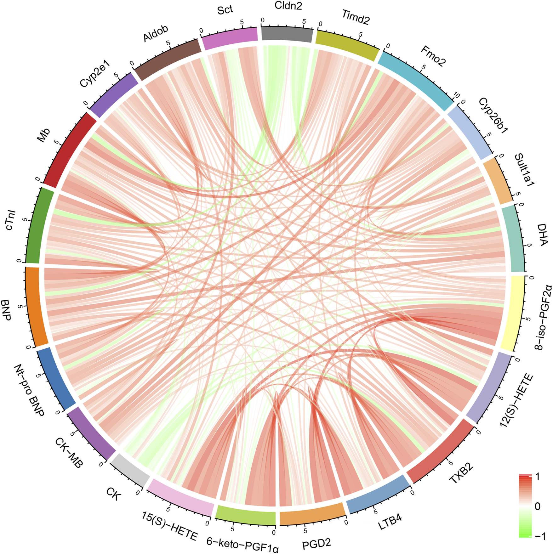 Correlation analysis was performed to assess the inter-relationships among genes, metabolites, myocardial enzymes, and cardiac injury markers. As shown in Figure 5, Cyp2e1 was positively correlated with several differential metabolites, including 8-iso-PGF2α, 12(S)-HETE, TXB2, LTB4, PGD2, and 6-keto-PGF1α. Aldob was positively correlated with 8-iso-PGF2α, 12(S)-HETE, TXB2, and PGD2. DHA, a differential metabolite, was positively correlated with differential genes Fmo2 and Timd2, as well as heart injury markers BNP and Mb.