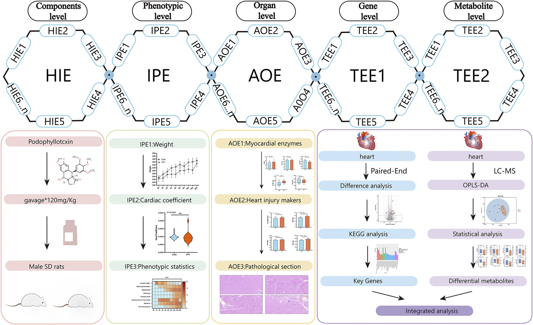 Based on the concept of the toxicological evidence chain (TEC), we utilized targeted metabolomic and transcriptomic analyses to reveal the mechanism of the acute cardiotoxicity of PPT. The manifestation of toxicity in Sprague-Dawley rats, including changes in weight and behavior, served as Injury Phenotype Evidence (IPE). To determine Adverse Outcomes Evidence (AOE), the hearts of the rats were evaluated through histopathological examination and by measuring myocardial enzyme and cardiac injury markers levels. Additionally, transcriptome analysis, metabolome analysis, myocardial enzymes, and cardiac injury markers were integrated to obtain Toxic Event Evidence (TEE) using correlation analysis.