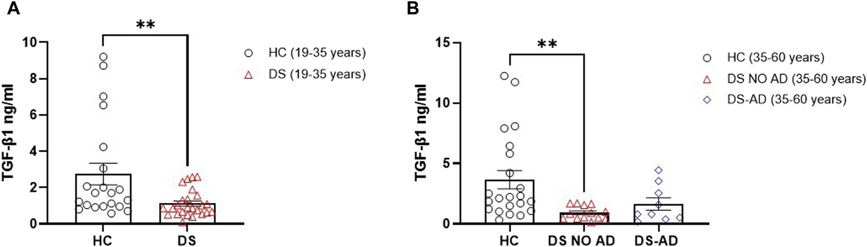 Deficit of TGF-β1 concentrations in the plasma of individuals with DS. Plasma TGF-β1 concentrations measured by ELISA assay in (A) young adult individuals with DS (19–35 years, n = 25) and healthy controls (HC) (19–35 years, n = 21); t-test unpaired, non-parametric test, Mann–Whitney test, **p < 0.01 DS (19–35 years) vs. HC; (B) older adult with or withour Alzheimer’s disease (AD)-related cognitive decline individuals with DS (35–60 years, n = 9 and n = 13, respectively) and HC (35–60 years, n = 22); one-way ANOVA, non-parametric test, Kruskal–Wallis test, Dunn’s post hoc test, **p < 0.01 DS NO AD (35–60 years) vs. HC (35–60 years), not significant (n.s.) DS-AD (35–60 years) vs. HC (35–60 years). All data are shown as mean ± SEM.