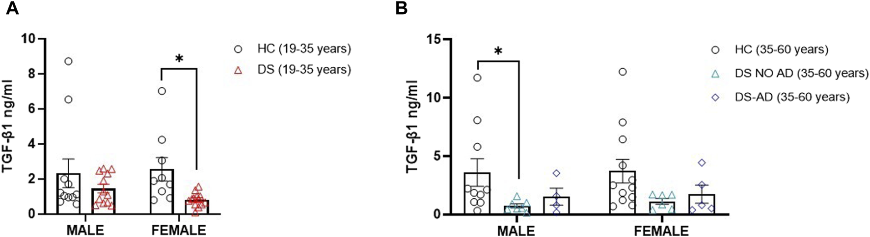 Plasma TGF-β1 concentrations at baseline following gender. Plasma TGF-β1 concentrations measured by ELISA assay in (A) male and female young adults with DS (19–35 years, male n = 12, female n = 13), *p < 0.05 female DS (19–35 years) vs. female healthy controls (HCs) (19–35 years, n = 9), n.s. male DS (19–35 years) vs. male HC (19–35 years, n = 11); and in (B) male and female older adult individuals with DS (35–60 years, male n = 7, female n = 6), older adult DS-AD (35–60 years, male n = 4, female n = 5) and HC (35–60 years, male n = 10, female n = 12), *p < 0.05 male DS NO AD (35–60 years) vs. HC male (35–60 years), n.s. male DS-AD (35–60 years) vs. male HC (35–60 years), and n.s. in the female group. One-way ANOVA, non-parametric test, Kruskal–Wallis test, and Dunn’s post hoc test are conducted. All data are shown as mean ± SEM.