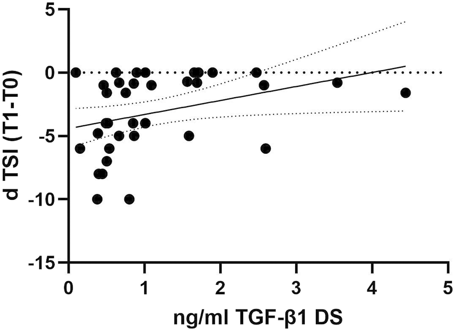 To investigate whether the decline in TGF-β1 plasma concentrations can predict cognitive decline progression in DS individuals, we examined the association between plasma concentrations of TGF-β1 at baseline (T0) and the following rate of cognitive decline calculated for each individual as dTSI (DS subjects n = 36). No association was found between age and TGF-β1 concentrations at T0 (Pearson r 0.1124, p = 0.51, DS subjects n = 36). Interestingly, we found that lower TGF-β1 plasma concentrations at T0 were strongly correlated with the cognitive decline assessed by the TSI score at T1 (12 months) in individuals with DS (Figure 3, Spearman r 0.4427, p < 0.01), suggesting that a decline in TGF-β1 plasma concentrations could be associated with cognitive decline in adult individuals with DS.