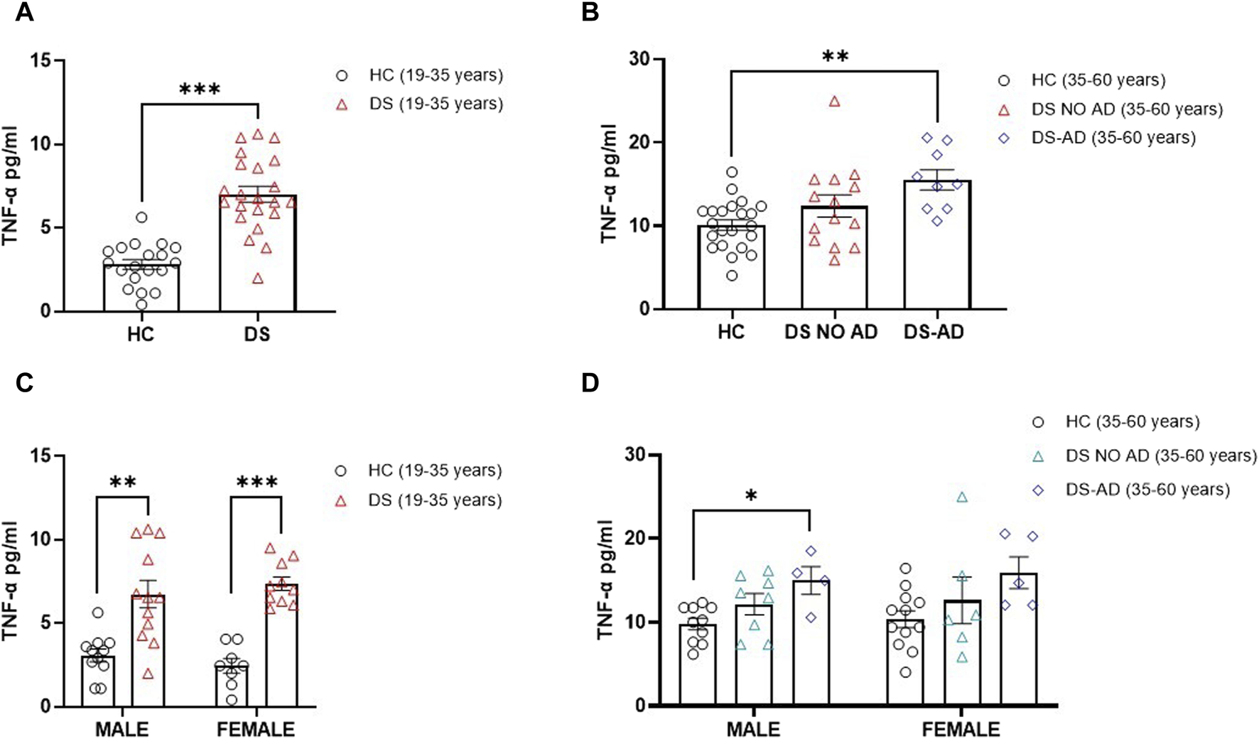 Plasma concentrations of TNF-α in individuals with DS. Plasma TNF-α concentrations measured by ELISA in (A) young adult individuals with DS (19–35 years, n = 22) and healthy controls (HC) (19–35 years, n = 19); t-test unpaired, non-parametric test, Mann–Whitney test, ***p < 0.001 DS (19–35 years) vs. HC; (B) older adult with or withour Alzheimer’s disease (AD)-related cognitive decline in individuals with DS (35–60 years, n = 9 and n = 14, respectively) and HC (35–60 years, n = 22); one-way ANOVA, non-parametric test, Kruskal–Wallis test, Dunn’s post hoc, **p < 0.01 DS-AD (35–60 years) vs. HC, n. s. DS NO AD (35–60 years) vs. HC; (C) male and female young adult individuals with DS (19–35 years, male n = 12, female n = 10), one-way ANOVA, non-parametric test, Kruskal–Wallis test, Dunn’s post hoc test, **p < 0.01 male DS (19–35 years) vs. male HC (19–35 years, n = 11), ***p < 0.001 female DS (19–35 years) vs. female HC (19–35 years, n = 8); (D) male and female older adult individuals with DS (35–60 years, male n = 8, female n = 6), and older adult DS-AD (35–60 years, male n = 4, female n = 5); one-way ANOVA, Non-parametric test, Kruskal–Wallis test, Dunn’s post hoc, *p < 0.05 male DS-AD (35–60 years) vs. male HC (35–60 years, n = 10), n.s. DS NO AD (35–60 years) vs. male HC, n.s. in the female group compared to female HC (35–60 years, n = 12). All data are shown as mean ± SEM.