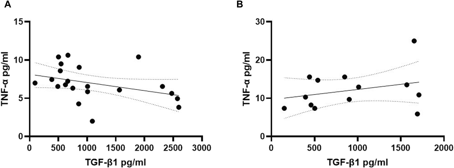 TGF-β1 plasma concentrations correlated with TNF-α plasma concentrations in young adult DS individuals. Correlation between the plasmatic concentration of TGF-β1 and TNF-α at T0 in (A) young adult DS individuals (19–35 years, n = 21); simple linear regression, Spearman r −0.5576, 95% CI: −0.8023 to −0.1525, **p < 0.01; and in (B) older adult DS (35–60 years, n = 13); simple linear regression, Spearman r 0.1598, 95% CI: −0.4438 to 0.6636, p = 0.59.
