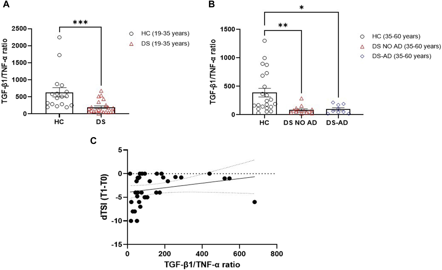 Plasma TGF-β1/TNF-α ratio in the DS population. TGF-β1/TNF-α ratio in (A) young adult DS individuals (19–35 years, n = 22), t-test unpaired, non-parametric test, Mann–Whitney test, ***p < 0.001 DS (19–35 years) vs. HC (19–35 years, n = 17); and in (B) older adult with or withour Alzheimer’s disease (AD)-related cognitive decline DS individuals (35–60 years, n = 9 and n = 13, respectively), one-way ANOVA, non-parametric test, Kruskal–Wallis test, Dunn’s post hoc, **p < 0.01 DS NO AD (35–60 years) vs. HC (35–60 years, n = 22), *p<0.05 DS-AD (35–60 years) vs. HC (35–60 years). (C) Correlation between TGF-β1/TNF-α ratio and the rate of cognitive decline calculated for each individual as dTSI (T1 TSI–T0 TSI/12 months) in individuals with DS (n = 35). Simple linear regression, Spearman r 0.3930, 95% CI: 0.05861 to 0.6482, *p< 0.05.