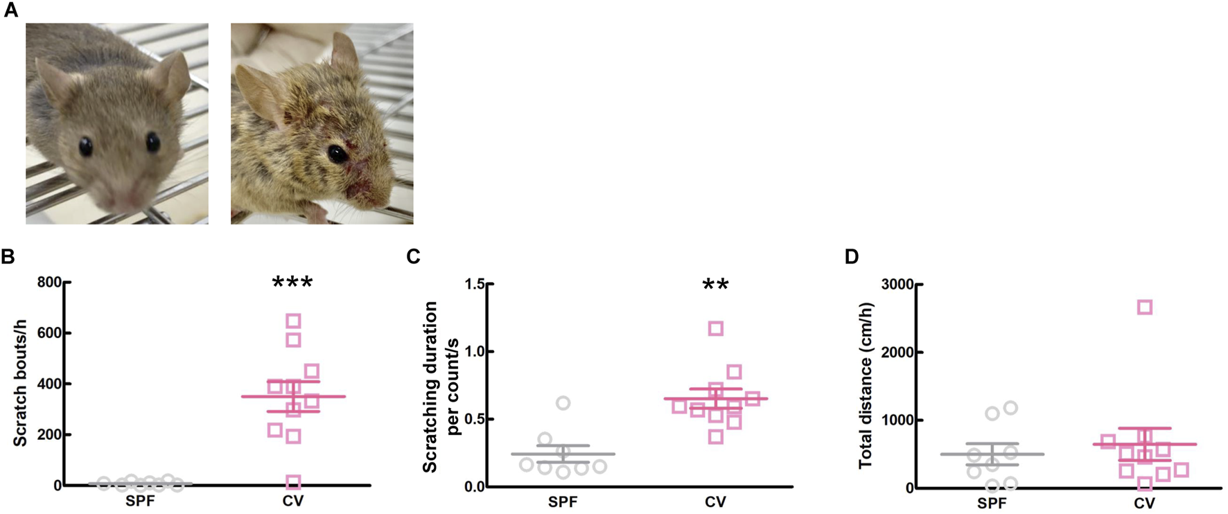 Figure 1. The comparisons of dermatitis and spontaneous behavior between SPF and CV mice. (A) Representative images of inflammation of face in SPF (left) and CV (right) mice. (B–D) Behavioral analysis between SPF and CV mice. Values represented the means and S.E.M (n = 8–10). (B) The number of scratching behaviors for 1 h ***p < 0.001, (Mann Whitney test). (C) Duration for one scratching behavior. **p < 0.01, (Mann Whitney test). (D) Total distance moved for 1 h as locomotor activity.