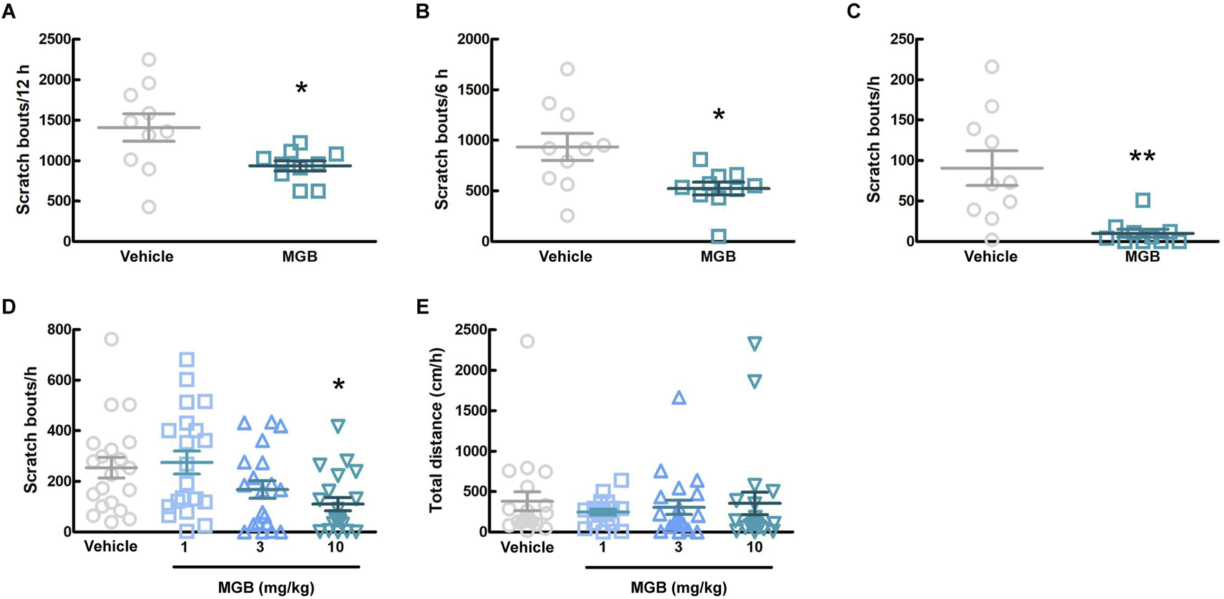 Figure 2. Effect of mirogabalin (MGB) on scratching behavior and locomotor activity in CV mice. (A–C) The number of spontaneous scratching behavior of CV mice was measured for 12 h after oral administration of vehicle or MGB (10 mg/kg). Values represented the means and S.E.M (n = 10). (A) Analyzed for 12 h *p < 0.05, (Mann Whitney test). (B) Analyzed for 6 h *p < 0.05, (Unpaired t-test). (C) Analyzed for 1 h from 2.5 to 3.5 h after administration. **p < 0.01, (Mann Whitney test). (D, E) Dose-dependent effect of MGB in CV mice. Values represented the means and S.E.M (n = 20). (D) The number of scratching behavior for 1 h *p < 0.05, (vs. vehicle, Kruskal–Wallis test–Dunnett’s test). (E) Total distance moved for 1 h as locomotor activity.