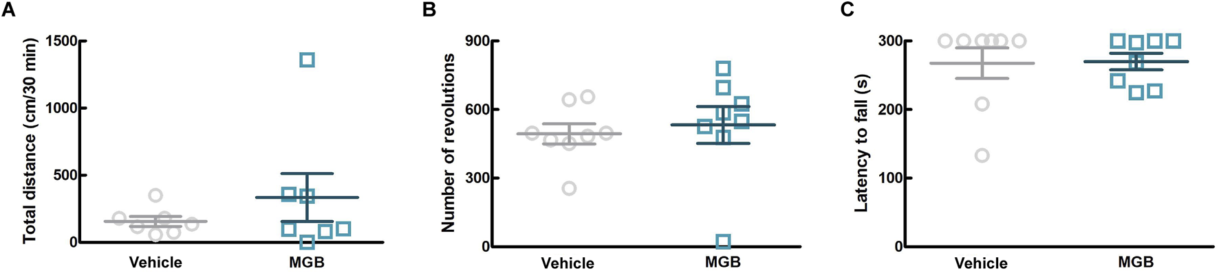 Figure 3. Effect of MGB on locomotor function in SPF mice. (A–C) Vehicle or MGB (10 mg/kg) were administered orally in SPF mice before behavioral test. Values represented the means and S.E.M (n = 7–8). (A) Locomotor activity test. (B) Running wheel test. (C) Rotarod test.