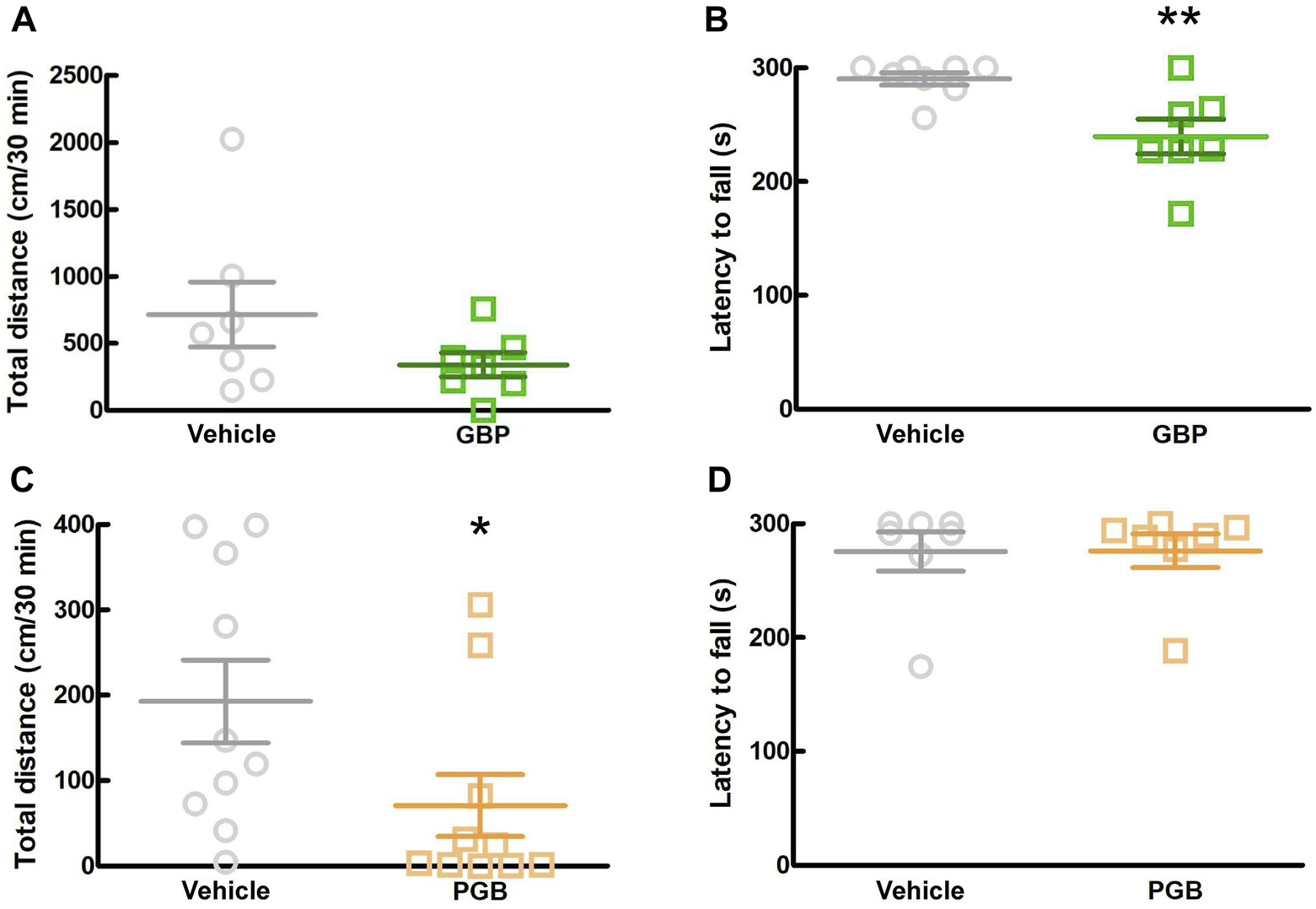 Figure 5. Effect of GBP and PGB on locomotor function in SPF mice. (A, B) Vehicle or GBP (100 mg/kg) were administered orally in SPF-mice. Values represented the means and S.E.M (n = 6–8). (A) Locomotor activity test. (B) Rotarod test. **p < 0.01, (vs. vehicle, Unpaired t-test). (C, D) Vehicle or PGB (30 mg/kg) were administered orally in SPF-mice. Values represented the means and S.E.M (n = 5–10). (C) Locomotor activity test. *p < 0.05, (vs. vehicle, Mann Whitney test). (D) Rotarod test.