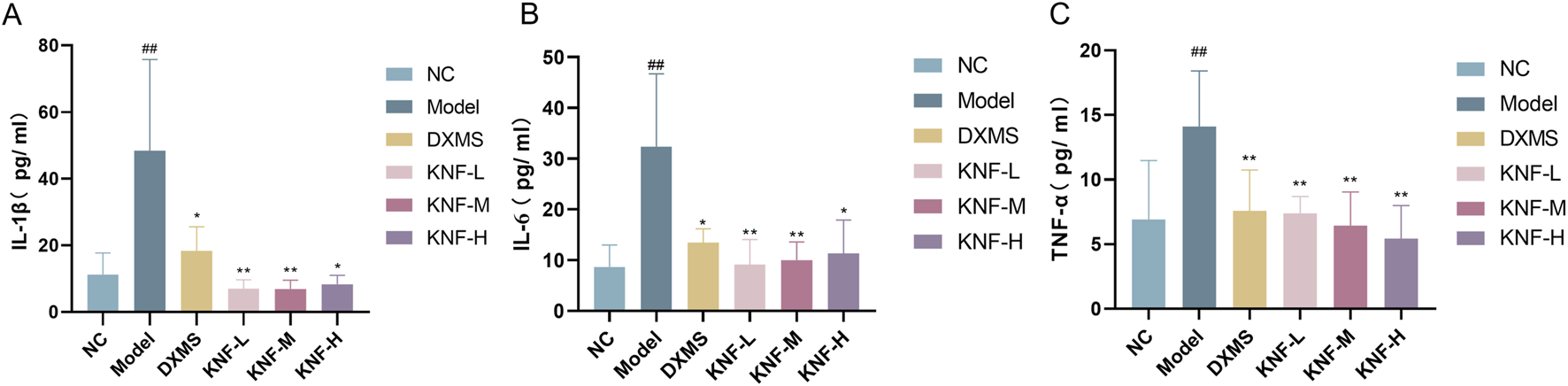 Figure 2. KN decoction alleviates serum inflammatory indicators in PIA rats (n = 10). (A) Serum IL-1β levels measured in rats; (B) Serum IL-6 levels measured in rats; (C) Serum TNF-α levels measured in rats. ##p < 0.01 compared to the Normal Control. ∗p < 0.05, ∗∗p < 0.01 compared to the Model. NC: normal control; Model: PIAs model; DXMS: Dexamethasone; KNF-L: low dose of KN Decoction (4.9 g/kg); KNF-M: medium dose of KN Decoction (9.8 g/kg); KNF-H: high dose of KN Decoction (19.6 g/kg).