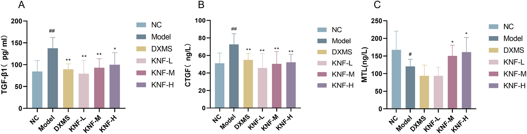 Figure 3. Effect of KN decoction on tissue fibrosis and intestinal protective effects in PIA rats (n = 10). (A) TGF-β1 levels measured in adherent intestinal tissues of rats; (B) CTGF levels measured in adherent intestinal tissues of rats; (C) MTL levels measured in the ileum of rats. #p < 0.05, ##p < 0.01 compared to the Normal Control. ∗p < 0.05, ∗∗p < 0.01 compared to the Model.