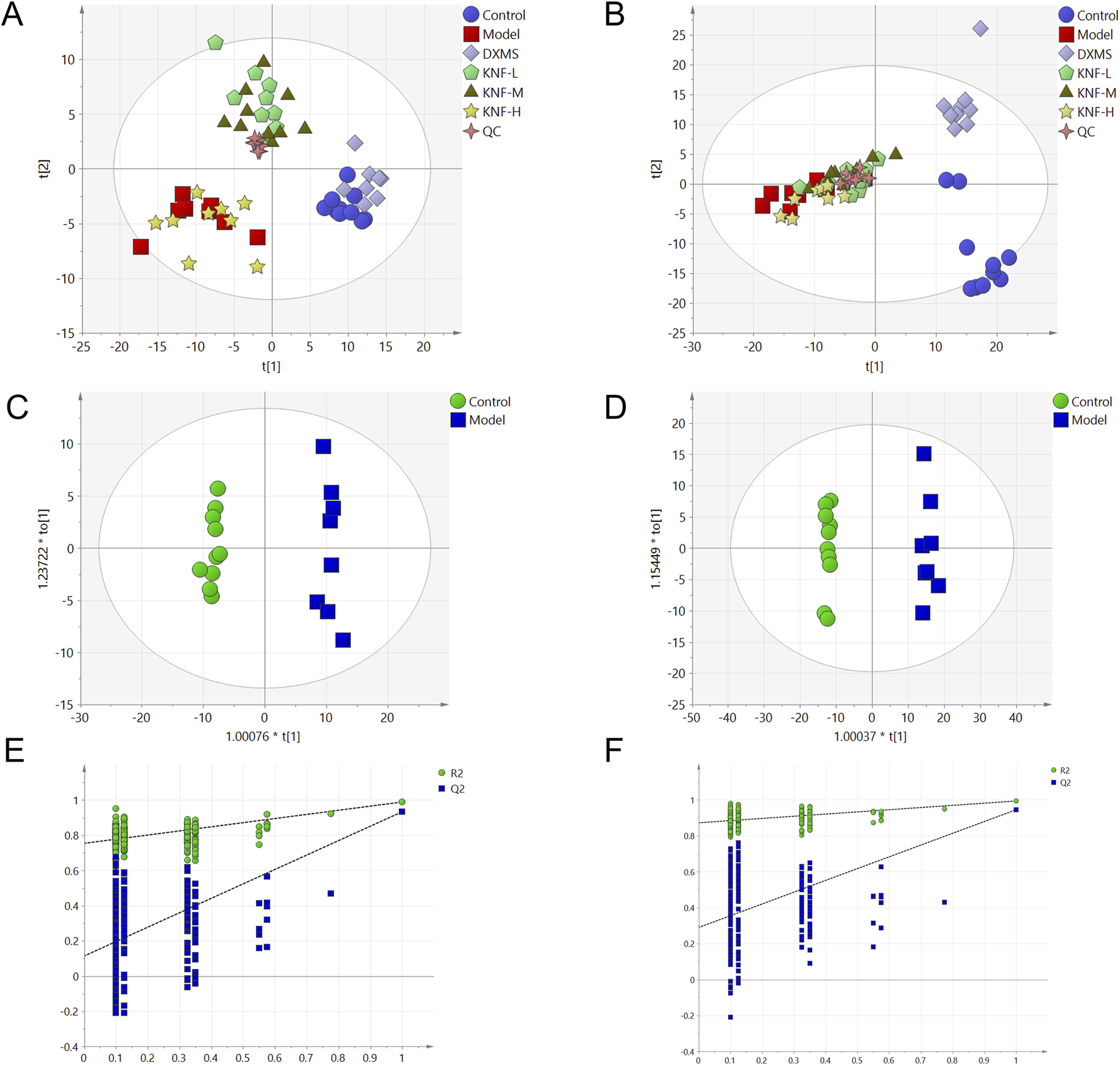 Figure 4. Multidimensional statistical analysis of tissue metabolites. (A) PCA score plot in negative ion mode; (B) PCA score plot in positive ion mode; (C) OPLS-DA score plots from the NC group and model group (n = 10) in negative ion mode; (D) OPLS-DA score plots from the NC group (n = 10) and model group (n = 10) in positive ion mode; (E) the permutation tests in negative ion mode (n = 200); (F) the permutation tests in positive ion mode (n = 200).