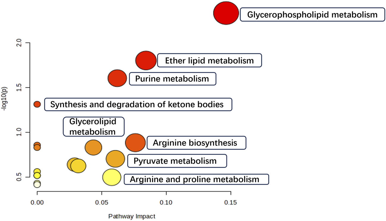 We finally identified 58 variables as potential biomarkers. Compared to the NC group, 29 of the identified biomarkers were highly expressed, while the rest had low expression levels in the model group. The MetaboAnalyst 5.0 platform was used to identify the related pathways. The enrichment results revealed 17 target pathways with marked perturbations. Among them, seven main pathological processes (glycerophospholipid metabolism, ether lipid metabolism, purine metabolism, synthesis and degradation of ketone bodies, arginine biosynthesis, glycerolipid metabolism, and pyruvate metabolism) were involved in intestinal adhesion development, indicating the role of multiple pathway dysfunctions in the pathological process of PIAs (Figure 5).