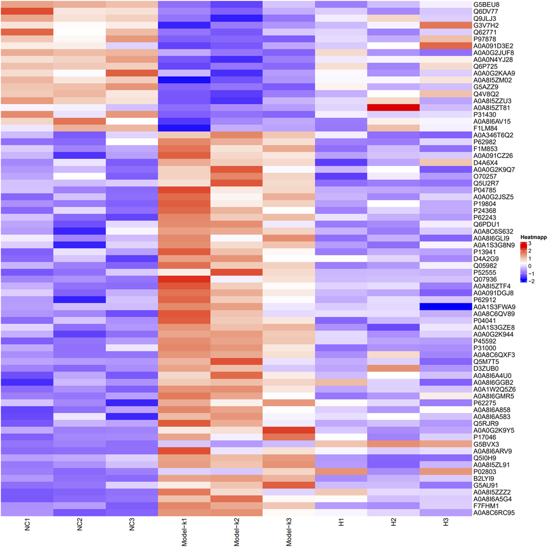 Figure 6. Heat map presenting DEPs between groups (Red represents upregulated, and blue represents downregulated in protein expression).