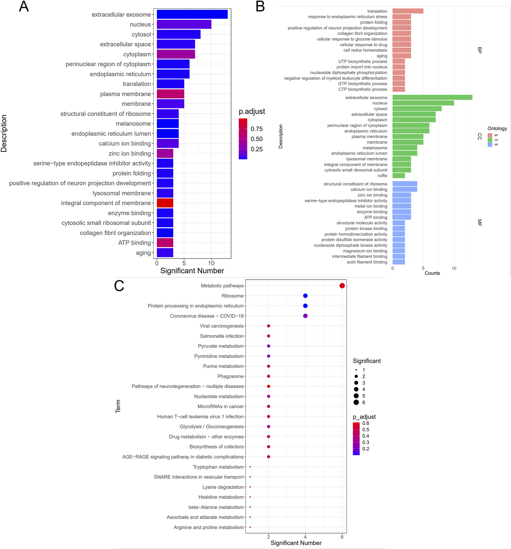 As presented in Figure 7, GO (7A, 7B) and KEGG (7C) enrichment analyses were performed. In Figures 7A, B, smaller p-values and higher blue saturation represent significant differences in biological function, with longer bars representing a higher number of enriched proteins for the specific biological function. The differential proteins were primarily involved in translation, Endoplasmic Reticulum Stress (ERS) response, protein folding, positive regulation of neuron projection development, collagen fibril organization, and cellular response to glucose stimulus, among other biological processes. On the other hand, the DEPs were concentrated in cellular components such as extracellular exosome, nucleus, cytosol, cellular space, cytoplasm, perinuclear region of the cytoplasm, and so on. Regarding molecular function, the differential proteins were mainly concentrated in the structural ribosome constituents, calcium/zinc ion binding, serine-type endopeptidase inhibitor activity, and enzyme binding. The KEGG pathway analysis results are shown in Figure 7C, with the vertical coordinates indicating the pathways enriched for DEPs. The bubble diagram was constructed using p-values and the number of differential proteins enriched to each pathway. According to the findings, the proteins were mainly involved in metabolic pathways, ribosomes, protein processing in the endoplasmic reticulum, viral carcinogenesis, and other pathways. Specific biologically significant gene sets that are markedly associated with each of the two sample sets in terms of expression or other measures could be identified through GSEA. In contrast, GO analysis can only be used to identify significant differential genes, as it screens for differential genes and then determines the annotated pathways in which the differential genes are enriched. On the other hand, GSEA is designed to identify genes with synergistic differences in the expression matrix of all genes, and from the gene set enrichment perspective, GSEA allows for the comprehensive assessment of the effects of subtle yet coordinated changes on biological pathways. The enrichment results associated the genomes revealed herein with valine, leucine, and isoleucine degradation, the MAPK signaling pathway, and retrograde endocannabinoid signaling (Figure 8). Furthermore, we used the PathCard platform to individually enrich the pathway information of the screened DEPs, and found that the differential proteins were associated with the MAPK/ERK signaling pathway, the VEGF pathway, EphB-EphrinB signaling, PI3K/AKT signaling, Reactive Oxygen Species (ROS) detoxification, and so on. Briefly, the interruption of these pathways may provide an avenue for developing molecularly targeted PIA therapies.