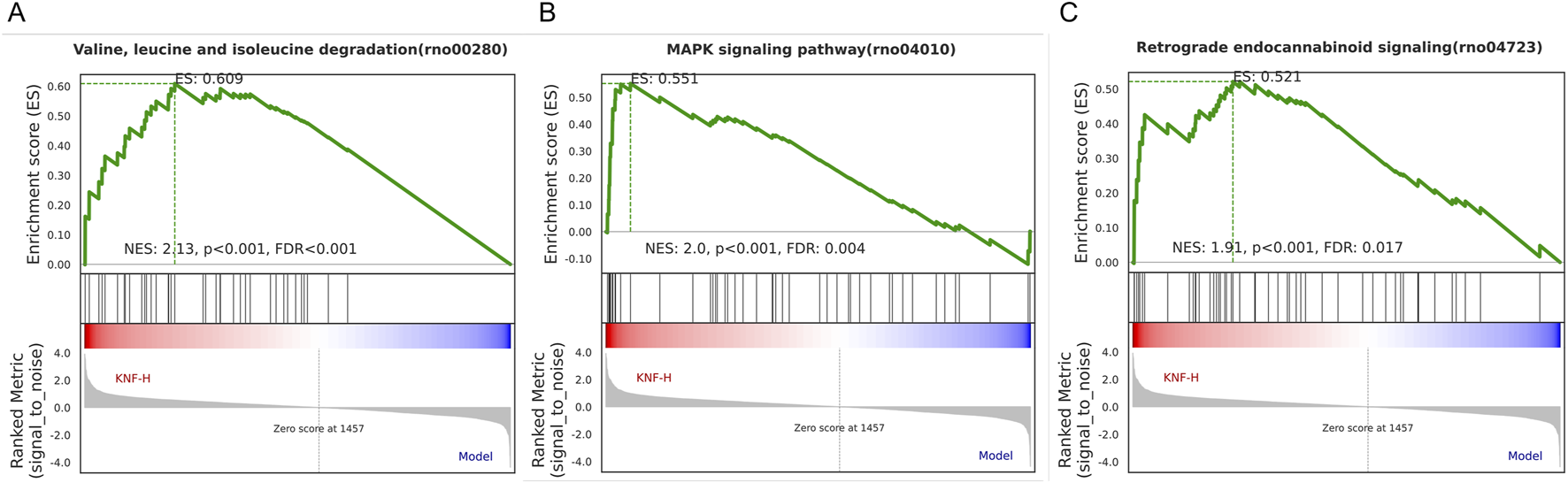 Figure 8. GSEA analysis of Valine, leucine, and isoleucine degradation (A), MAPK signaling pathway (B), and Retrograde endocannabinoid signaling (C).