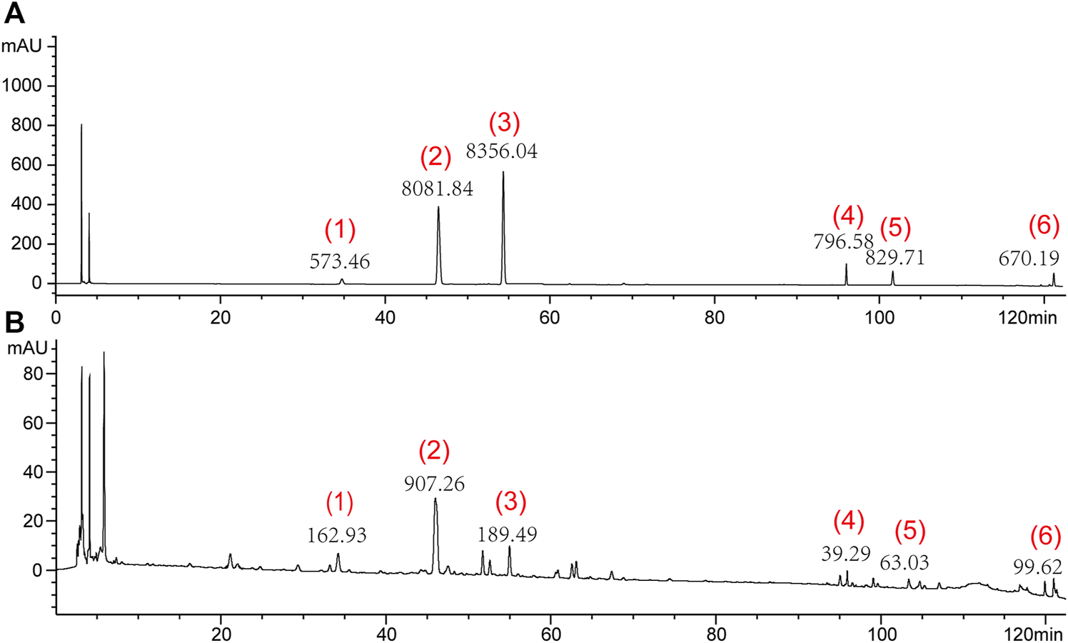 The HPLC analysis was performed using an Agilent 1100 liquid chromatography system (Agilent 1200, Agilent, United States). A 10 μL sample was injected into a TC-C18 column (4.6 mm× 250 mm, 5 μm) and eluted with a mobile phase gradient of acetonitrile (A) and 0.05% phosphoric acid (B) at a flow rate of 1.0 mL/min. The gradient elution program used a method described previously (Li and Huang, 2005), as follows: 0–10 min (10% A), 10–30 min (10%–12% A), 30–35 min (12%–18% A), 35–40 min (18% A), 40–42 min (18%–20% A), 42–62 min (20%–28% A), 62–70 min (28% A), 70–75 min (28%–30% A), 75–80 min (30%–33% A), 80–85 min (33% A), 85–95 min (33%–50% solvent A), 95–105 min (50% A), and 105–122 min (50%–90% A). The analytes were detected at a wavelength of 210 nm. Under these conditions, the six main components were well separated; the peak heights and areas of each component are shown in Figure 1.