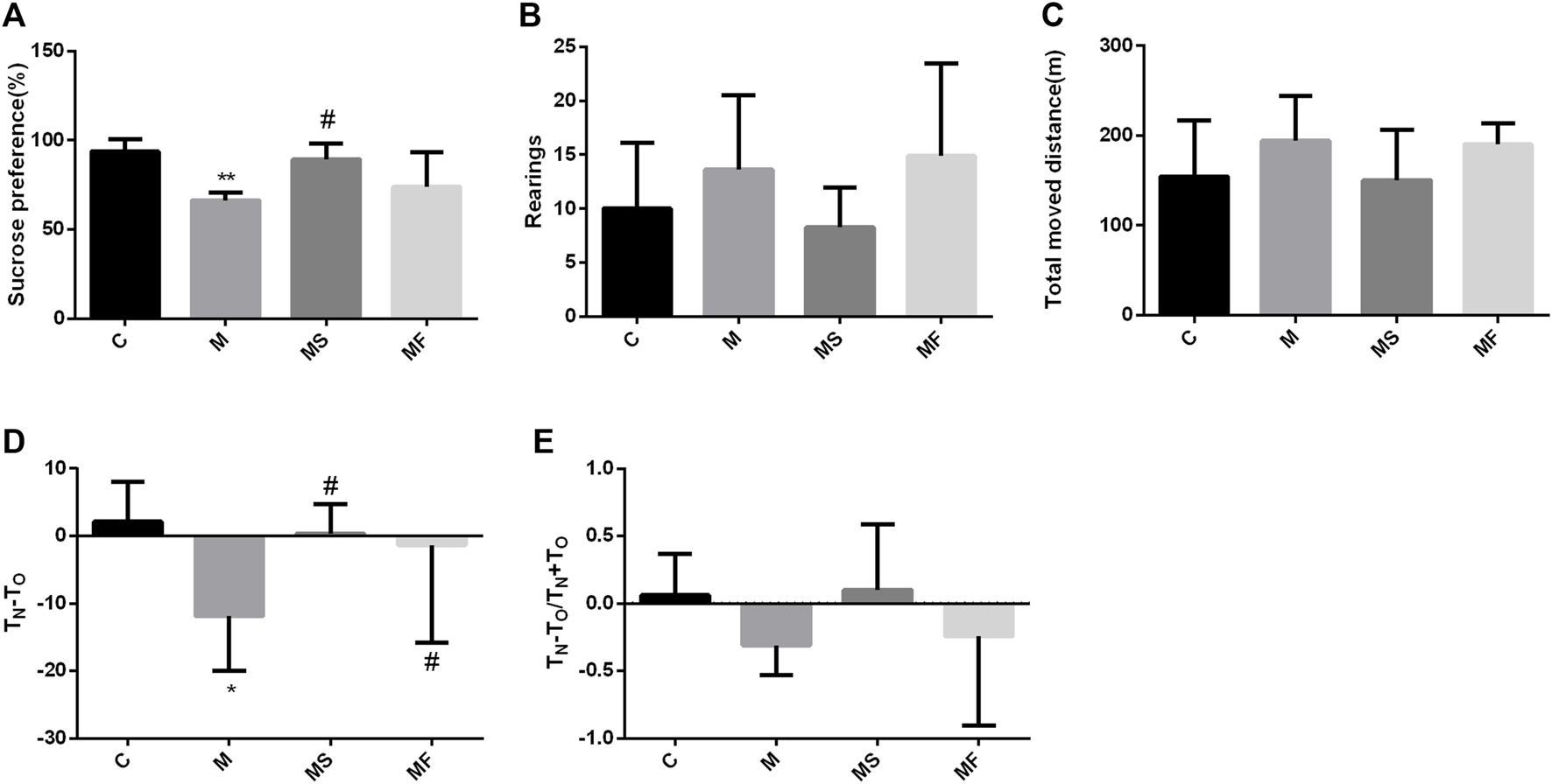 Effects of SNS on behavioral experiments. (A) Result of SPT. (B) Rearings in the OFT. (C) Total moved distance in the OFT. (D) TN-TO in the NOR. (E) TN-TO/TN+TO in the NOR. *P < 0.05 compared with C group. #P < 0.05 compared with M group.