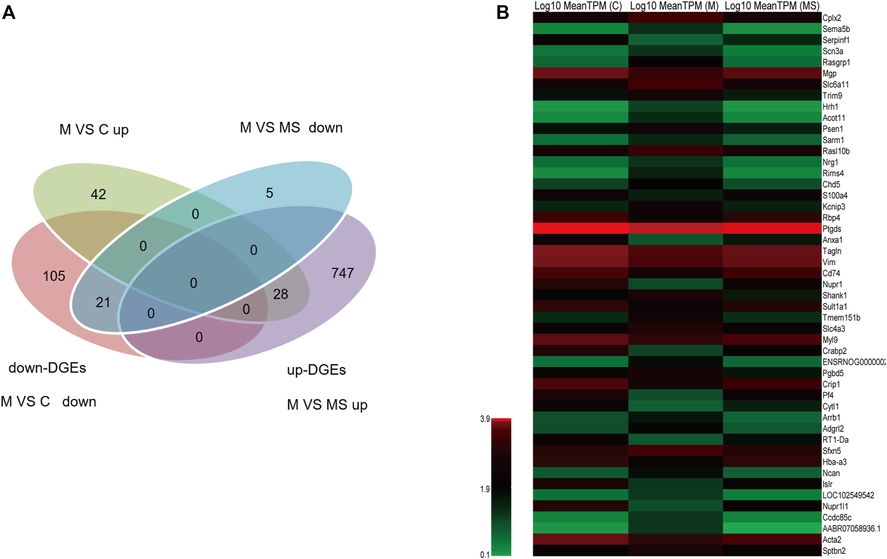 Identification of DEGs reversed by SNS in the pons. (A) The intersection gene of DEGs (M vs. C and M vs. MS, down- and upregulated, respectively). (B) The expression level of the 49 filtered DEGs in C, M and MS groups.