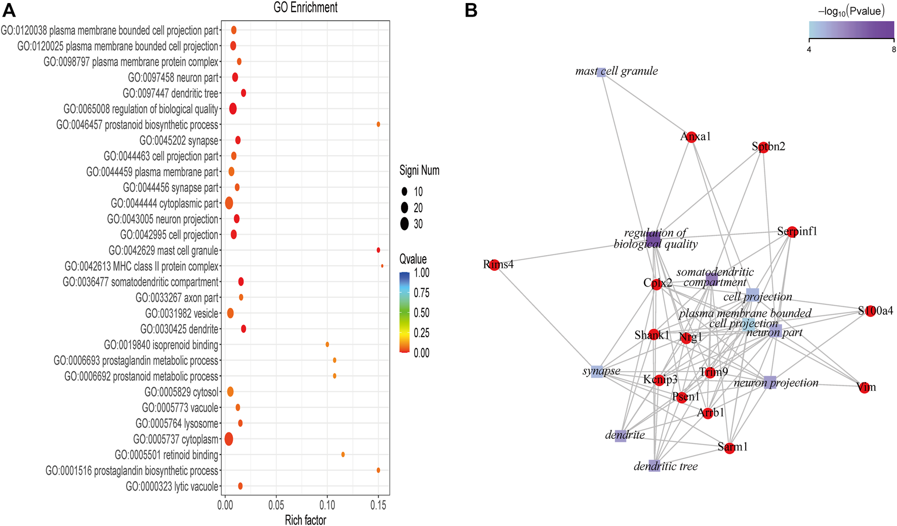 To further understand the DEGs related to the treatment of depression using SNS, GO enrichment analysis was performed on the 49 DEGs using ClusterProfiler. Figure 4A displays the top 30 GO terms with the highest enrichment factor. Of the GO terms, 19 were significantly enriched in the 49 DEGs, with one term belonging to the BP category and 18 terms belonging to the CC category, all with a q-value of <0.05. The top 10 enriched GO-terms were ranked as follows: regulation of biological quality (GO:0065008), somatodendritic compartment (GO:0036477), dendrite (GO:0030425), dendritic tree (GO:0097447), neuron projection (GO:0043005), neuron part (GO:0097458), mast cell granule (GO:0042629), cell projection (GO:0042995), synapse (GO:0045202), and plasma membrane bounded cell projection (GO:0120025). The top10 GO-terms and related significant DEGs were selected to construct a significant enrichment function-gene interaction network. The functional gene network consisted of 10 GO-terms nodes, 14 gene nodes, and 94 interactions, as shown in Figure 4B. Specific information of the 14 genes in the functional gene network is provided in Supplementary Table S1.