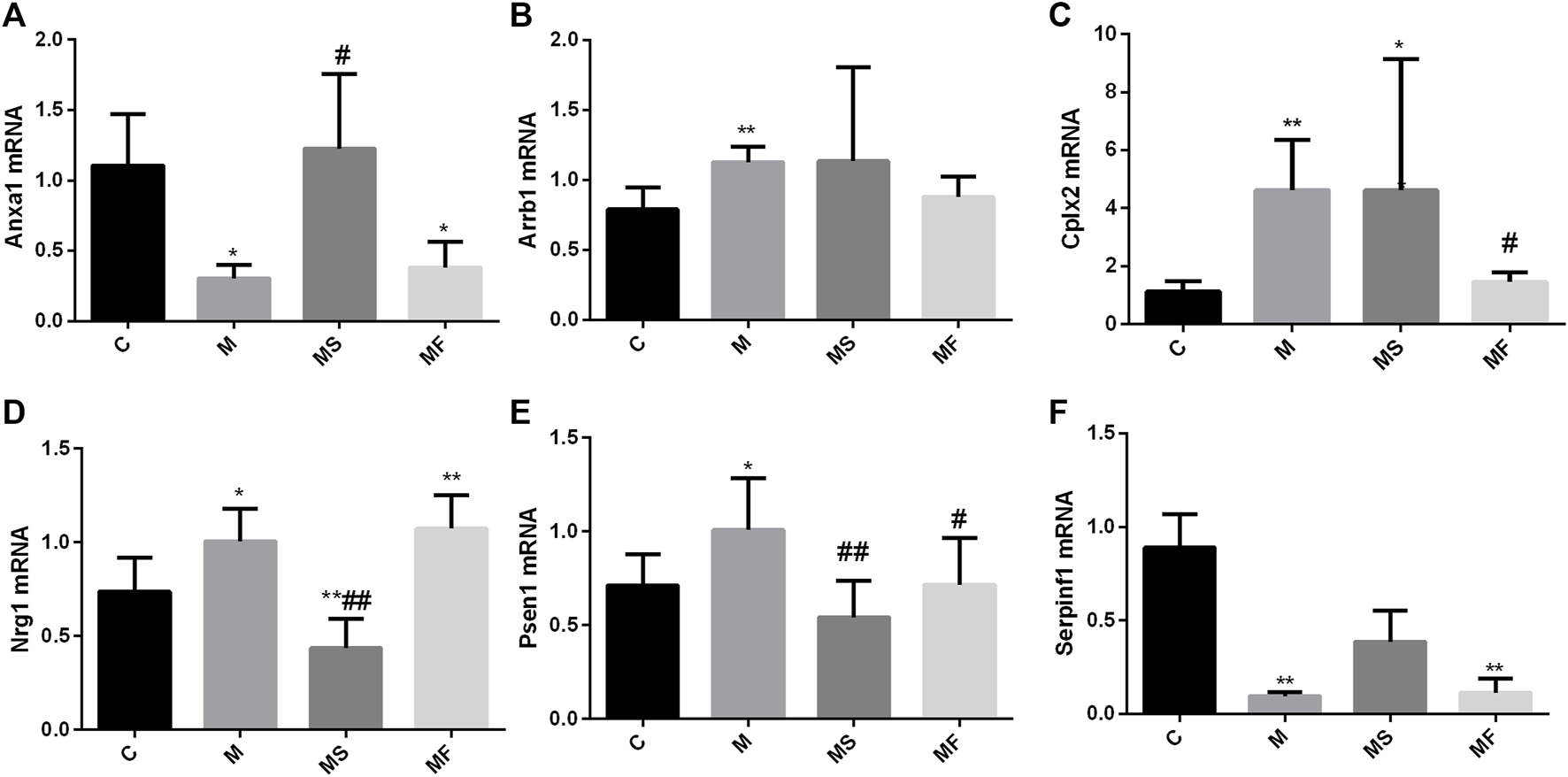 As shown in Figure 5, Arrb1, Cplx2, Nrg1, and Psen1 were overexpressed in the M group compared to those in the C group. Anxa1 and Serpinf1 showed low expression levels in the M group, as determined using real-time PCR. SNS significantly reversed the expression of Anxa1, Nrg1, and Psen1, but did not significantly affect the expression of Arrb1and Cplx2. Serpinf1 expression in the MS group showed an increasing trend, but this was not statistically significant. Fluoxetine significantly reversed the expression of Cplx2 and Psen1.