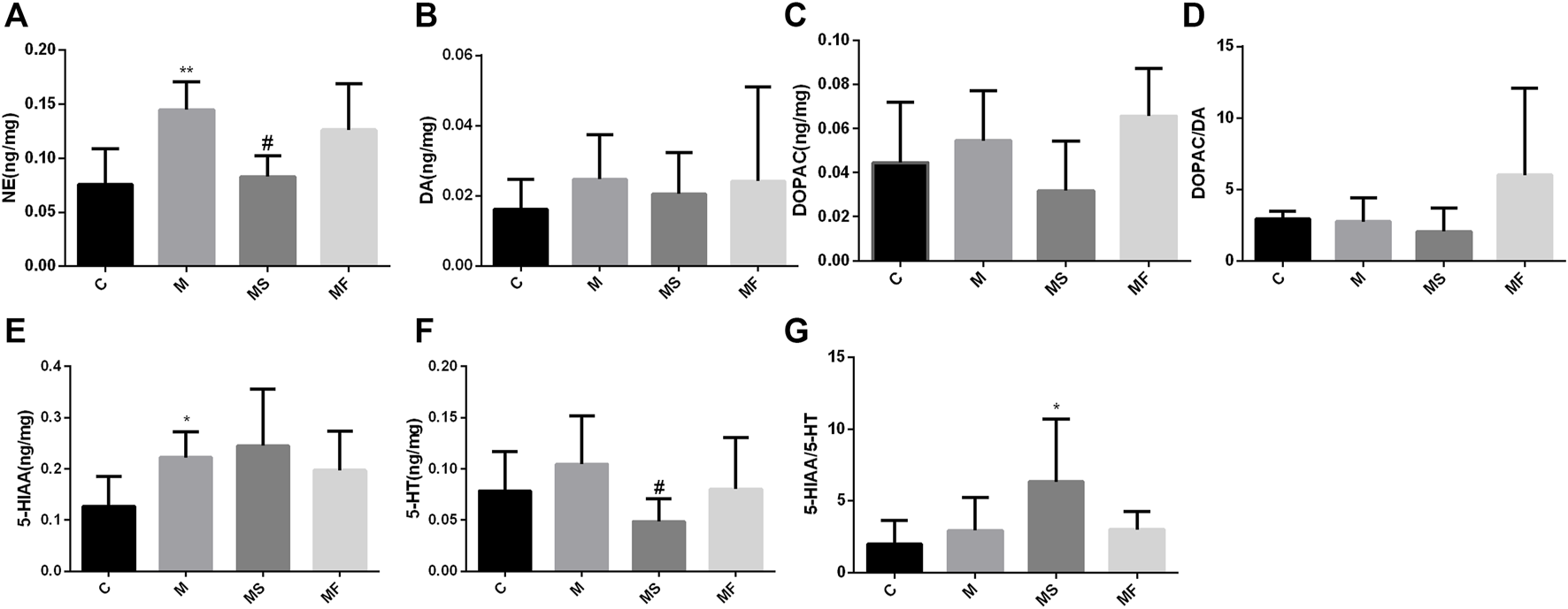 Effects of SNS on the neurotransmitters in pons. (A) NE, (B) DA, (C) DOPAC, (D) DOPAC/DA, (E) 5-HIAA, (F) 5-HT, (G) 5-HIAA/5-HT. **P < 0.05 compared with C group. **P < 0.01 compared with C group. #P < 0.05 compared with M group. ##P < 0.01 compared with M group.