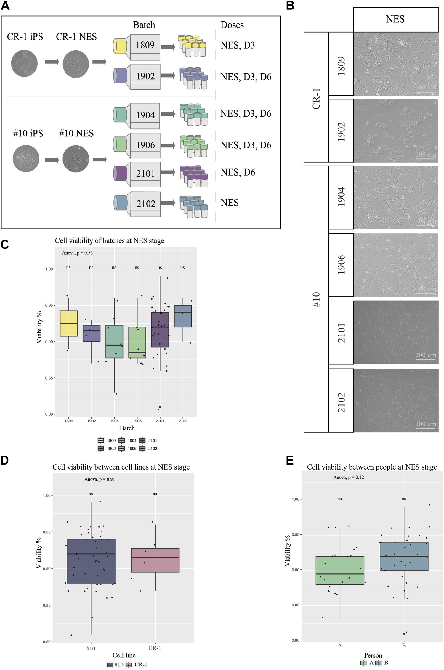 Characterization of cells from all batches for cell therapy (A) Schematic overview of experimental procedure. Two clinically relevant cell lines were used to derive six different batches of cell therapy doses. (B) BF images of cell therapy doses 24 h post thawing. Cells from all batches and differentiation stages contained high numbers of viable cells with the typical NES cell morphology. Scale bar: 100 μm or 200 μm. (C) Viability at thawing was determined by trypan blue viability counting for all six batches at NES stage (1809 N = 2, 1902 N = 4, 1904 N = 8, 1906 N = 8, 2101 N = 30, 2102 N = 3). (D) Cell viability compared in-between the two cell lines of origin, NES doses (CR-1 N = 6, #10 N = 49). No statistical significance of cell viabilities was seen in-between batches or cell lines. (E) Cell viability compared in-between person A and B for doses at NES stages (A N = 22, B N = 33) showed no significant difference in cell viability between people handling the cells. Significance was tested using a one-way ANOVA and t-test.