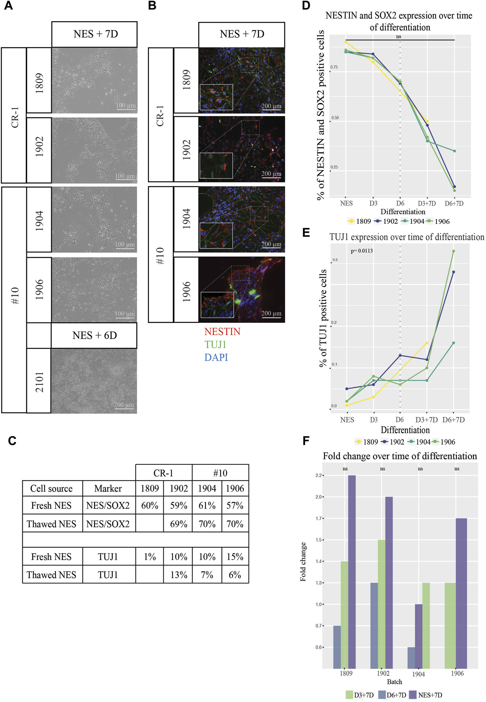 Quantifications of the expression of cell type specific markers by in vitro differentiated cell doses was tested using flowcytometry (Figures 4C–F). The percentage of cells expressing both NES cell markers NESTIN and SOX2, declined gradually (right of dotted line) according to the trend observed before freezing (left of the dotted line) (Figure 4D). NESTIN/SOX2 expression in cells with the longest differentiation (D6+7D) showed as little as 15%–35% of double positive cells. 33.3% of cells expressed the neuronal marker TUJ1 for batch 1902, 16.0% for batch 1906 and 37.5% for batch 1904 at D6+7D (Figure 4C).