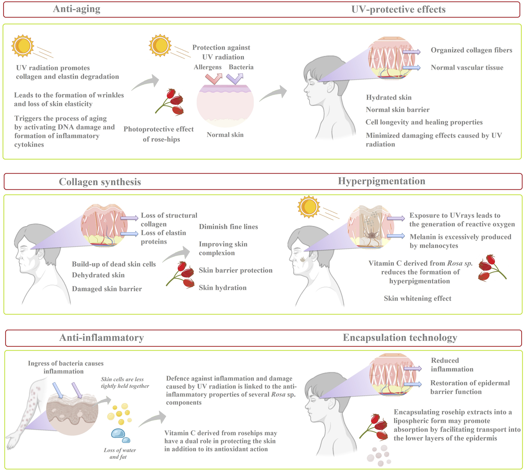 Overview of the potential effects of rosehip extracts as a therapeutic agent against multiple skin disorders.