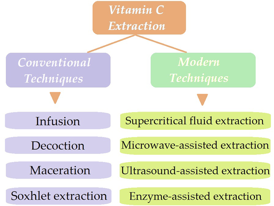 Different techniques for extracting naturally occurring physiologically active components have been proposed. As previously exemplified, conventional extraction techniques for vitamin C include infusions, decoctions, maceration, and Soxhlet extraction. Nevertheless, there are several drawbacks to these approaches, including their time-consuming, ineffective, and overpriced characteristics (Figure 2).