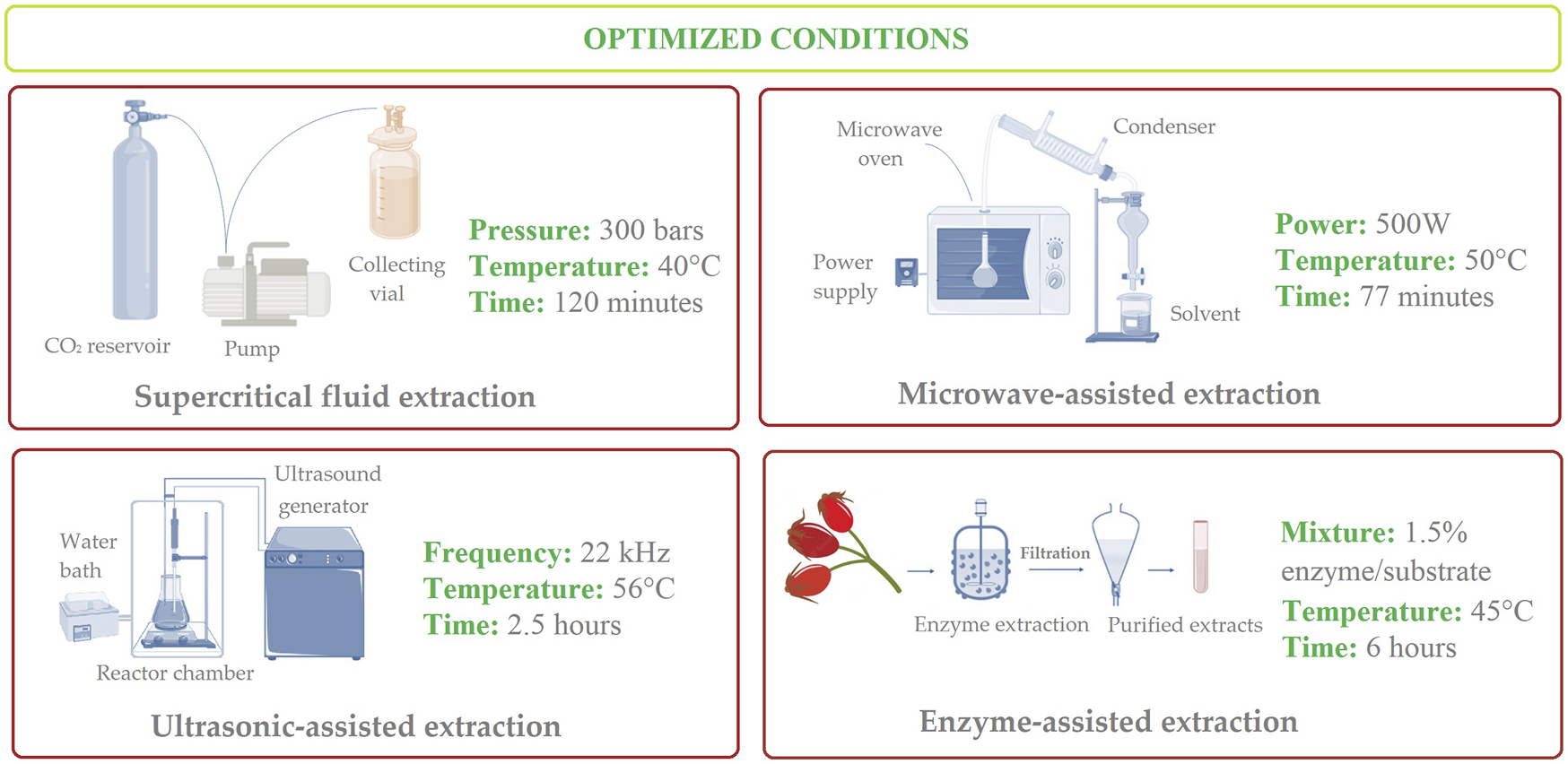 In response to these limitations, green approaches have recently gained attention due to their effective extraction of phytocompounds from rosehips (i.e., fluid extraction, microwave, and ultrasonication extractions) (Saini et al., 2024), that are exemplified in the following sub-sections. These techniques offer faster extraction times, higher yields, and reduced solvent consumption compared to traditional methods.