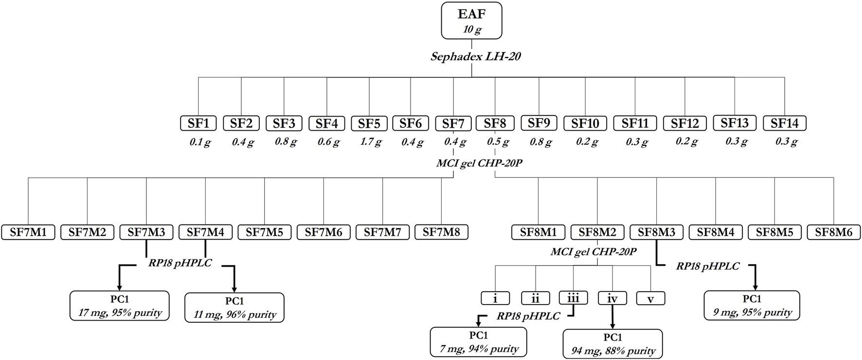 In brief, 10 g of EAF was first fractionated on the Sephadex LH-20 stationary phase (isocratic 100% ethanol) to afford 14 fractions (SF1–SF14) (Supplementary Table 1). Fractions SF7 (0.4 g) and SF8 (0.5 g) were fractionated on MCI-Gel CHP-20P (gradient MeOH/H2O 1:20 →1:0) to yield SF7M1–SF7M8 and SF8M1–SF8M6 (Supplementary Table 2), respectively. Fraction SF8M2 (288 mg) was purified on the MCI-Gel CHP-20P stationary phase (MeOH/H2O 1:20 →1:0), yielding 94 mg of PC1. Fraction ‘iii’ of SF8M2 (25 mg), SF7M3 (198 mg), SF7M4 (59 mg), and SF8M3 (18.5 mg) were purified by preparative HPLC to yield 7 mg, 17 mg, 11 mg, and 9 mg of PC1, respectively, amounting to a total of 138 mg of PC1 (Figure 2).