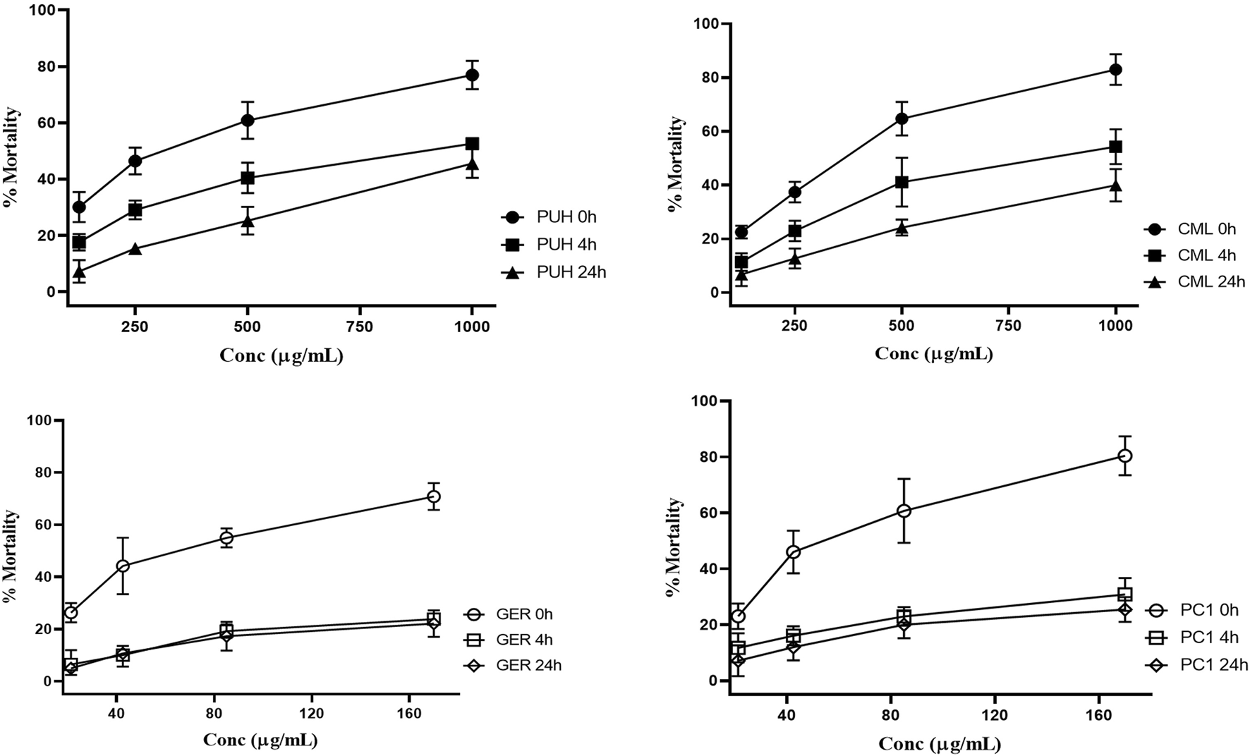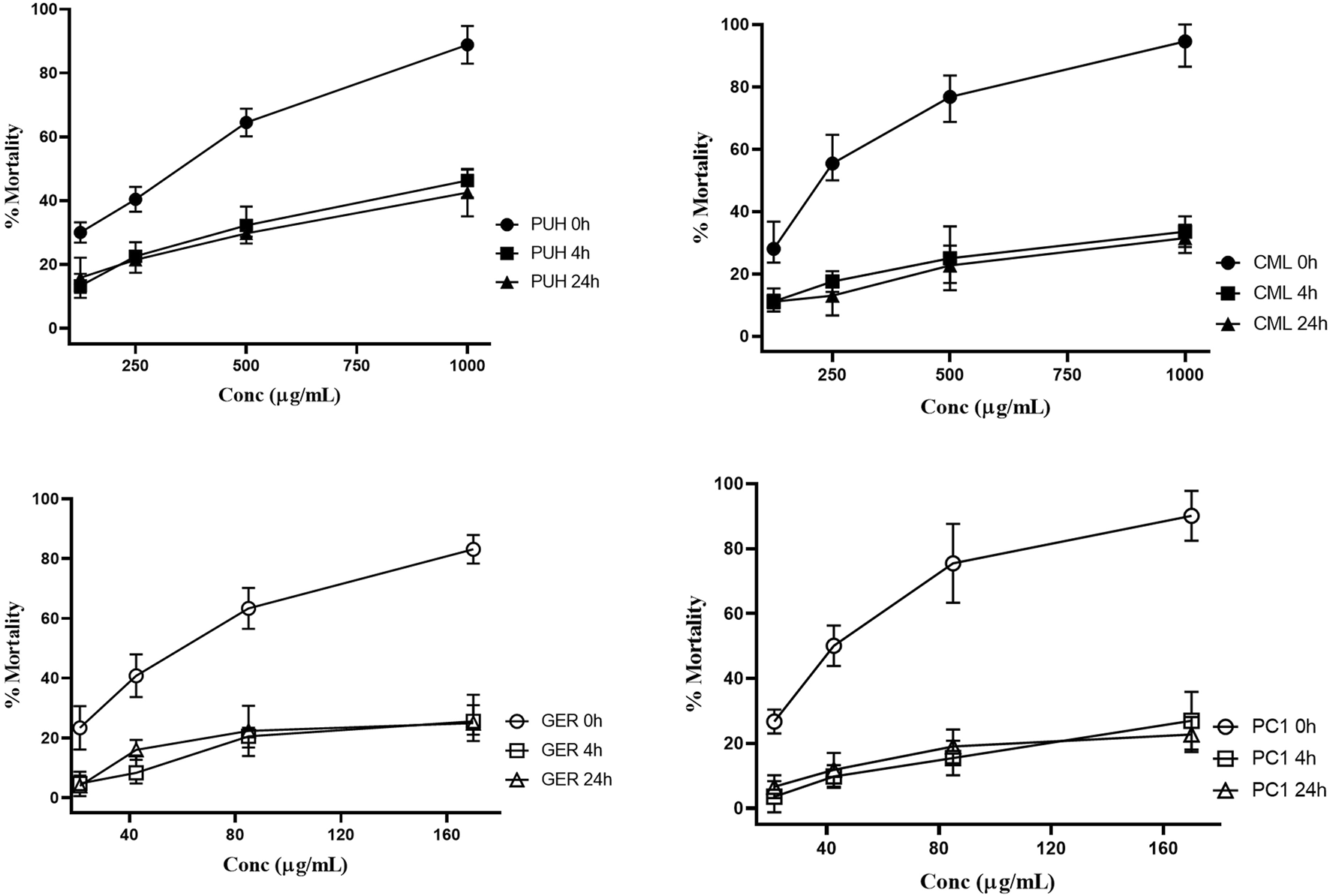 Treatment against stage-4 (L4) C. elegans larvae revealed similar effects in previous reports (Jato et al., 2023). In the unfermented state, the CML extract induced LC50 of 1,468.1 (CI: 990.3–1,946.5). The PUH extract and two compounds could not achieve inhibition that was sufficient to determine the LC50 values. All fermented samples (4 h and 24 h) had values lower than LC50 inhibition against this non-parasitic nematode (Table 1; Figure 5). The inhibitory activity of geraniin at 170 μg/mL (178.5 µM), however, decreased significantly from 30.4% ± 1.8% to 14.5% ± 1.5% when fermented for 4 h. A similar pattern was observed for PC1, for which the respective activity at 170 μg/mL (196.2 µM) against C. elegans larvae decreased from 32.4% ± 2.3% to 8.9% ± 0.9% after fermenting for 4 h.
