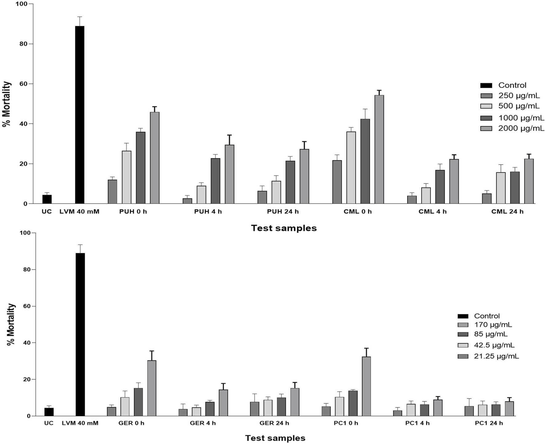Unlike the two structurally distinct compounds (Figure 1) whose activity against the human intestinal parasites were similar, the activity of the two extracts, PUH and CML, varied against both organisms. Although the PUH extract (0 h) induced LC50 of 300.8 (CI: 245.1–374.8) μg/mL and 331.6 (CI: 290.3–382.5) μg/mL against hookworm and whipworm, respectively, the CML extract (0 h) yielded LC50 of 343.5 (CI: 267.5–445.4) μg/mL and 230.1 (CI: 198.9–271.2) μg/mL, respectively. The similar effects seen in the compounds could be attributed to the nonspecific astringent effects of these tannins, leading to a general inhibition of protein-related processes in the helminths (Luck et al., 1994; Spiegler et al., 2017), and this differed for the extracts which are composed of very varied phytoconstituents.