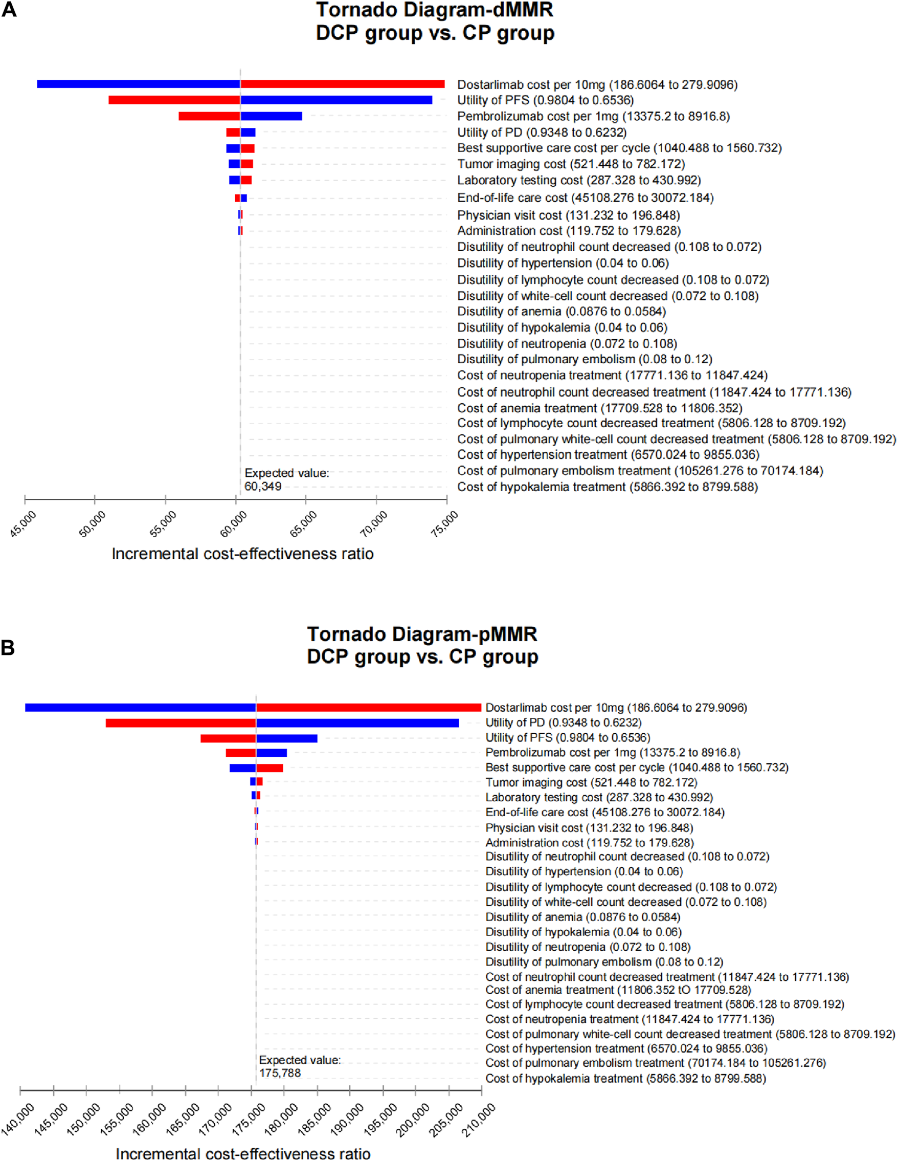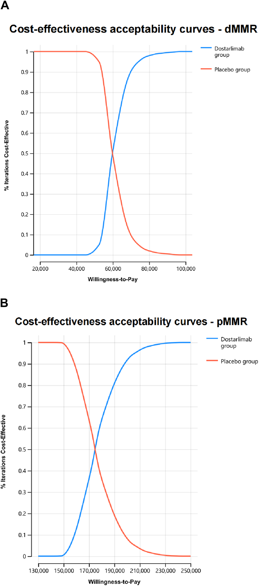 In dMMR EC, the combination of dostarlimab and chemotherapy achieved an additional 5.48 QALYs at an incremental cost of $330,747 compared to chemotherapy alone, resulting in an ICER of $60,349.30 per QALY. In pMMR EC, there were 1.51 additional QALYs gained at an extra cost of $265,148, yielding an ICER of $175,788.47 per QALY. With a 15.2% discount on dostarlimab, the ICER decreased to $150,000 per QALY in the pMMR EC. The univariate sensitivity analysis revealed that the cost of dostarlimab, utility of progression-free survival (PFS), and progressive disease (PD) had the most significant impacts on the outcomes. Probabilistic sensitivity analysis revealed that dostarlimab had a 100% likelihood of being considered cost-effective for patients at a WTP threshold of $150,000 per QALY for dMMR EC, whereas this likelihood was only 0.5% for pMMR EC.