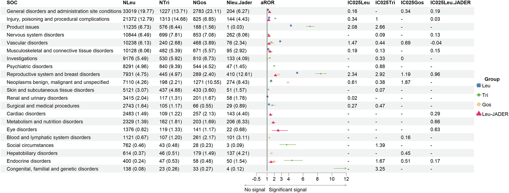 The system organ class (SOC) of all GnRHas, which conformed to the criterion (aROR025 > 1 or IC025 > 0), is showed in Figure 1. We detected that GnRHas-induced AEs occurred in 21 targeted organ systems, including Leu (9 SOCs), Tri (15 SOCs), Gos (8 SOCs), and Leu-JADER (11 SOCs). From Figure 1, we found that the SOC signals of Tri were the largest, including reproductive system disorders (aROR 8.44, 95% CI 7.68–9.29), product issues (aROR 6.97, 95% CI 6.41–7.59), endocrine disorders (aROR 4.46, 95% CI 3.35–5.94), social circumstances (aROR 3.72, 95% CI 2.76–5.02), injury conditions (aROR 2.14, 95% CI 2.02–2.27), psychiatric disorders (aROR 1.99, 95% CI 1.85–2.14), and skin disorders (aROR 1.17, 95% CI 1.06–1.29). Comparing FAERS and JADER, the SOC signals of Leu (FAERS) were more prominent in reproductive system disorders (aROR 5.28, 95% CI 5.07–5.30), product issues (aROR 4.32, 95% CI 4.24–4.41), vascular disorders (aROR 2.83, 95% CI 2.77–2.89), and renal/urinary disorders (aROR 1.05, 95% CI 1.02–1.09). Some SOC signals of Leu (JADER) demonstrated stronger signal values, including eye (aROR 2.53, 95% CI 1.66–3.85), metabolic (aROR 1.86, 95% CI 1.61–2.14), and cardiac disorders (aROR 1.48, 95% CI 1.25–1.76).