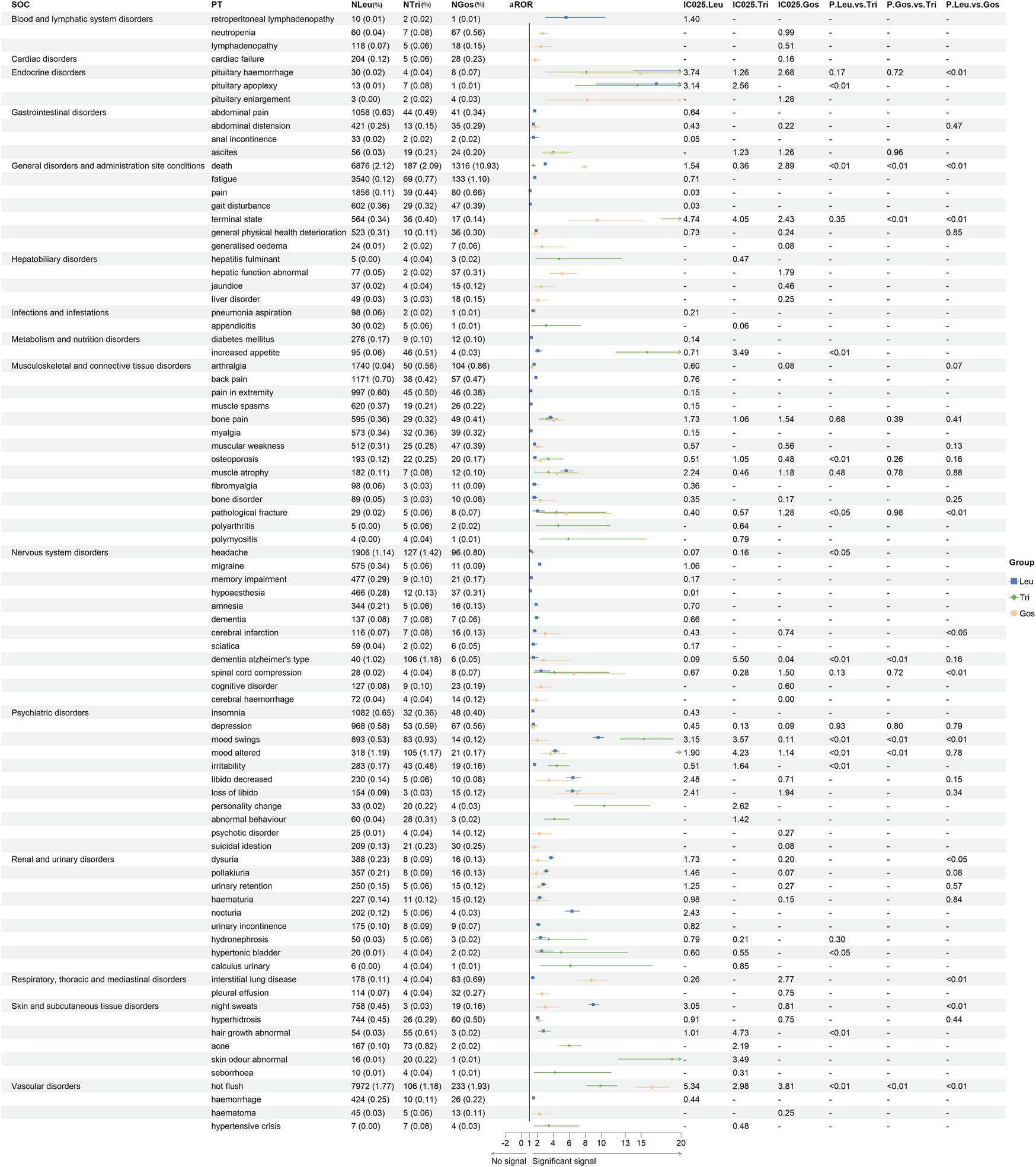 Figure 2 showed the same PTs (84 PTs from 15 SOCs) of GnRHas (Leu, Tri, and Gos) from FAERS, comparing the statistical significance of their signal strength by Pearson χ2 test. To facilitate analysis of this data, the negative signals were marked “-”. In blood system disorders, Leu and Gos showed stronger PTs signals, including retroperitoneal lymphadenopathy, neutropenia, and lymphadenopathy. In cardiac disorders, suspected PT of cardiac failure (Gos) detected the stronger signal (aROR 1.73, 95% CI 1.20–2.51). In the PT of death, the order of signal from strong to weak is Gos (aROR 7.90, 95% CI 7.46–8.37), Leu (aROR 2.98, 95% CI 2.91–3.06), and Tri (aROR 1.51, 95% CI 1.31–1.75). In hepatobiliary disorders, Leu and Gos showed stronger PTs signals than hepatitis fulminant, jaundice, and liver disorder. In musculoskeletal and connective tissue disorders, partial PTs only showed Leu having positive signals as back pain, extreme pain, muscle spasms, myalgia, and fibromyalgia. Moreover, two PTs (polyarthritis and polymyositis) were observed to be significantly associated with Tri.