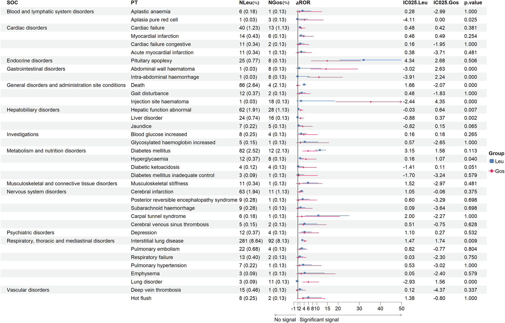 We collected the same PTs of Leu and Gos from JADER (Figure 3). From the same 36 PTs, we found ten with p < 0.05, including death (aROR, 4.03 vs. 0.81; p < 0.001), interstitial lung disease (aROR, 3.18 vs. 4.25; p = 0.009), injection site hematoma (aROR, 2.53 vs. 35.43; p < 0.001), hyperglycemia (aROR, 2.20 vs. 4.86; p = 0.040), abdominal wall hematoma (aROR, 1.70 vs. 14.36; p < 0.001), abnormal hepatic function (aROR, 1.31 vs. 2.41; p = 0.007), intra-abdominal hemorrhage (aROR, 0.91 vs. 10.97; p < 0.001), liver disorder (aROR, 0.87 vs. 2.31; p = 0.002), pure red cell aplasia (aROR, 0.80 vs. 4.20; p = 0.025), and lung disorder (aROR, 0.55 vs. 6.01; p < 0.001).