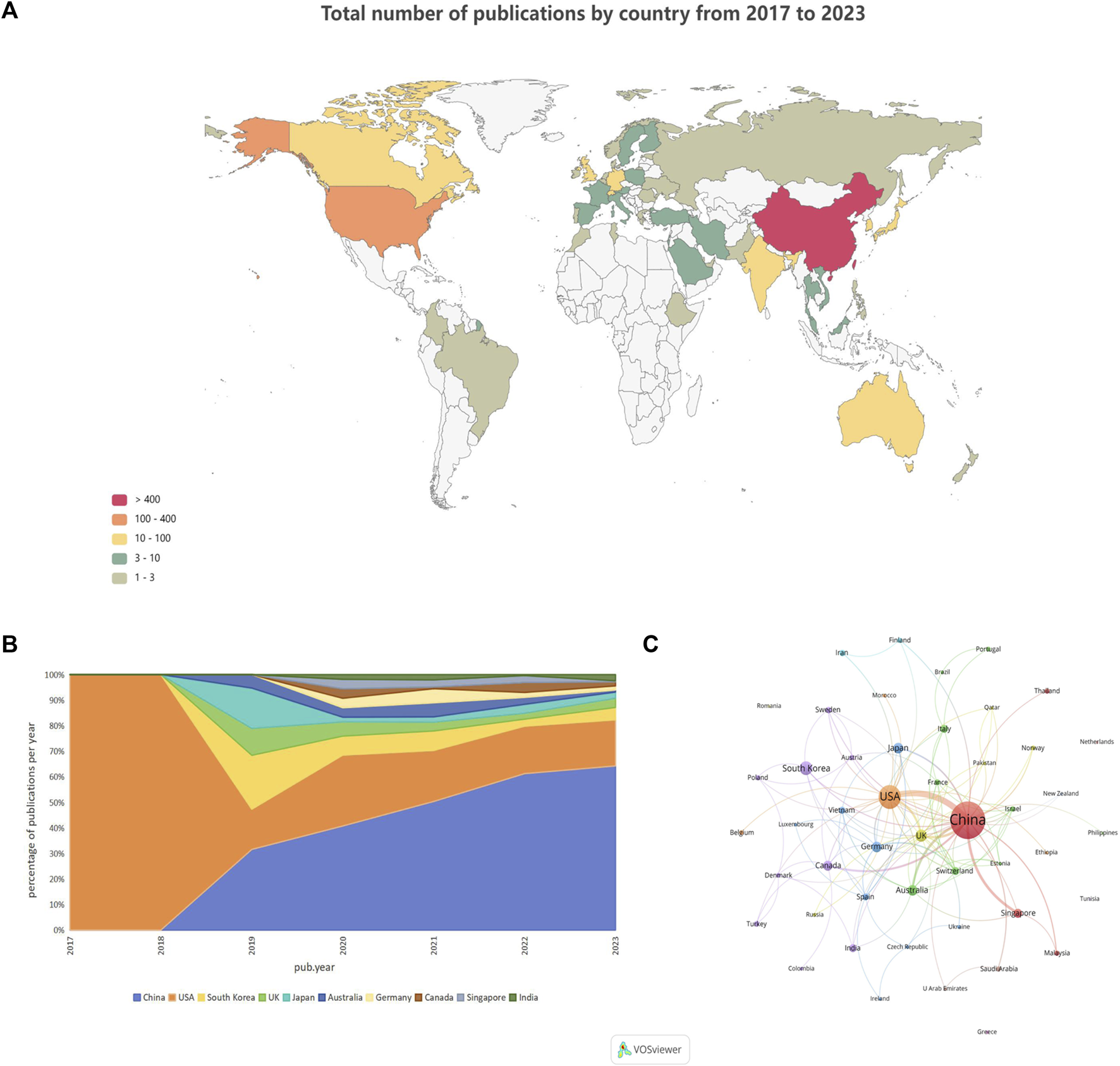 Country/region analysis (A). Geographical distribution of the total number of publications in the different countries and regions (B). Percentage of annual publications in the top 10 countries over the past 7 years (C). Visualization of country cooperation.