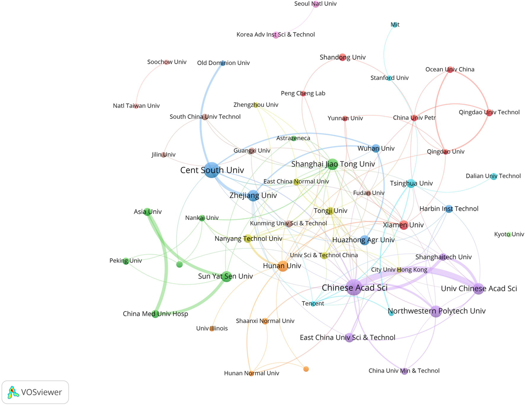 In this field, research institutions can reflect the distribution of scientific research units. According to a VOSviewer analysis of institutional partnerships, more than 800 institutions were involved in paper publication. The number of issuing institutions with more than or equal to five papers in the past 7 years was counted, for a total of 55 institutions. Table 4 reveals that the top 10 institutions in terms of the number of papers issued were all from China. Figure 4 illustrates the network of the institutional cooperation analysis, which VOSviewer clustered based on the cooperation relationships between these 55 institutions. The various clusters highlight the differences in the cooperation relationships and research directions among these institutions. Among them, the Chinese Academy of Science node is the largest, indicating that this institution published the most papers and had the same color as the nodes of the University Chinese Academy of Science and Northwestern Polytech University, indicating that they belonged to the same cluster (cooperation group), which suggests that the research direction of these institutions was similar and the frequency of their cooperation was also higher. In addition to cooperation and communication with domestic institutions, the Chinese Academy of Science has also established good cooperation and communication with foreign institutions, such as Nanyang Technological University.