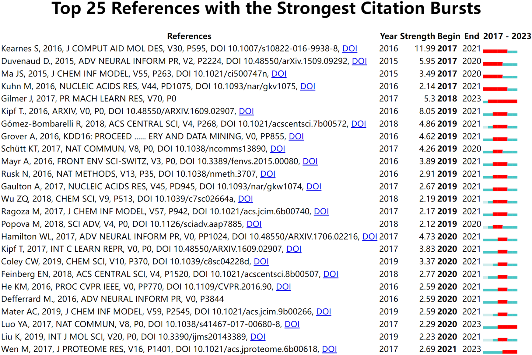 Publications from 2017 to 2023 about the application of graph neural network in drug discovery were collected from the Web of Science Core Collection. Bibliometrix, VOSviewer, and Citespace were mainly used for bibliometric studies.