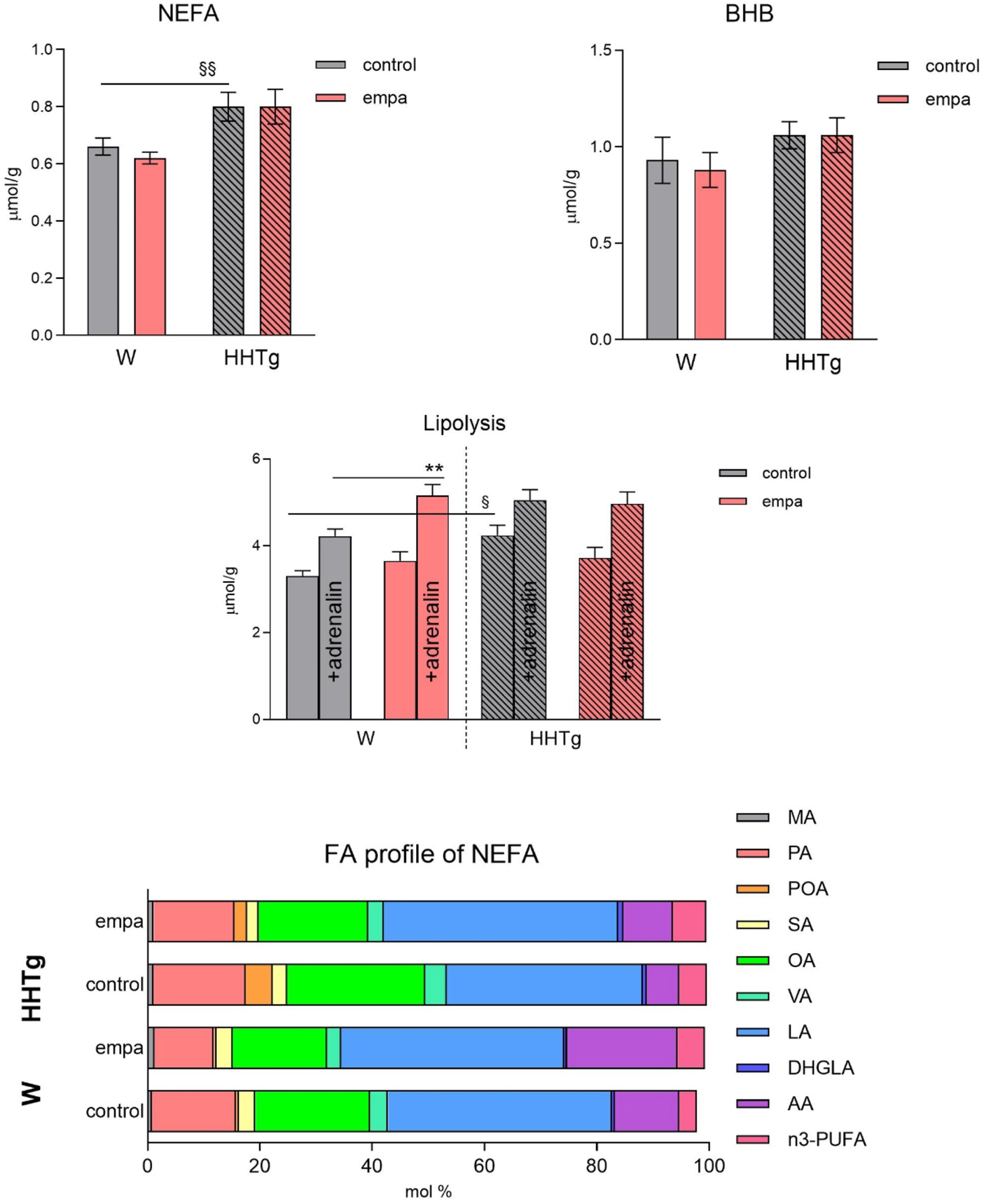 Effects of empagliflozin on serum NEFA, fatty acid profiles of NEFA, lipolysis, and ketone bodies in Wistar control and prediabetic HHTg rats. Data are expressed as the mean ± SEM; n = 8 for each group and analyzed by two-way ANOVA with Fisher’s LSD post hoc test; * denotes significance reflecting the effect of empagliflozin in Wistar rats; § denotes significance between nontreated Wistar and HHTg rats; ** denotes p ˂ 0.01; § denotes p < 0.05, §§p < 0.01. HHTg, hereditary hypertriglyceridemic; W, Wistar; BHB, β-hydroxy butyrate; MA, myristic acid; PA, palmitic acid; POA, palmitoleic acid; SA, stearic acid; OA, oleic acid; VA, vaccenic acid; LA, linoleic acid; DHGLA, dihomo-γ-linoleic acid; AA, arachidonic acid.